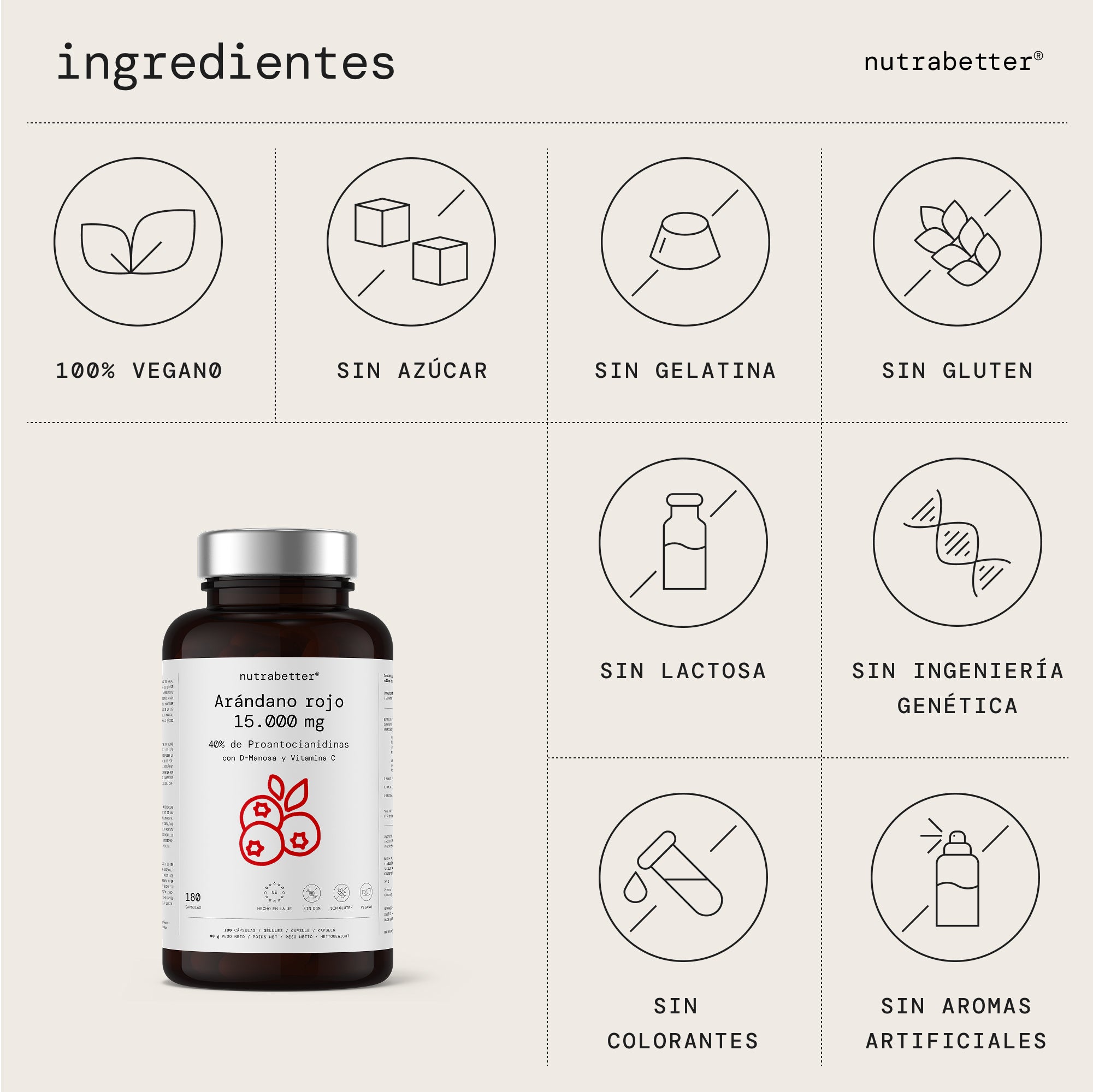 Con extracto de arándano rojo americano (Vaccinium macrocarpon) estandarizado al 40% en proantocianidinas (PACs), D-manosa y vitamina C, diseñados para apoyar la salud del tracto urinario y reforzar el sistema inmunitario.