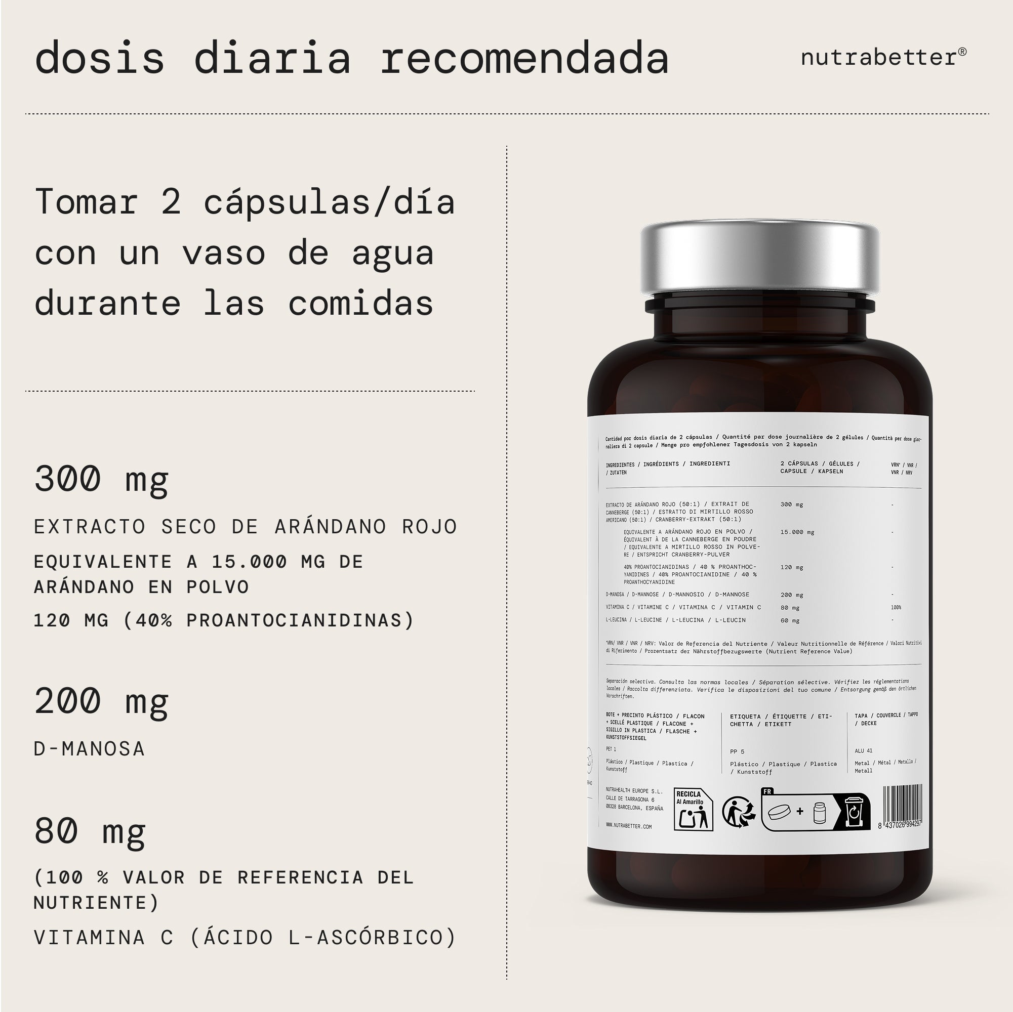 Extracto seco de arándano rojo (vaccinium macrocarpon aiton l., baya), d-manosa, cápsula vegetal (hidroxipropilmetilcelulosa, carbonato de calcio), harina de arroz, vitamina c (ácido l-ascórbico), l-leucina.