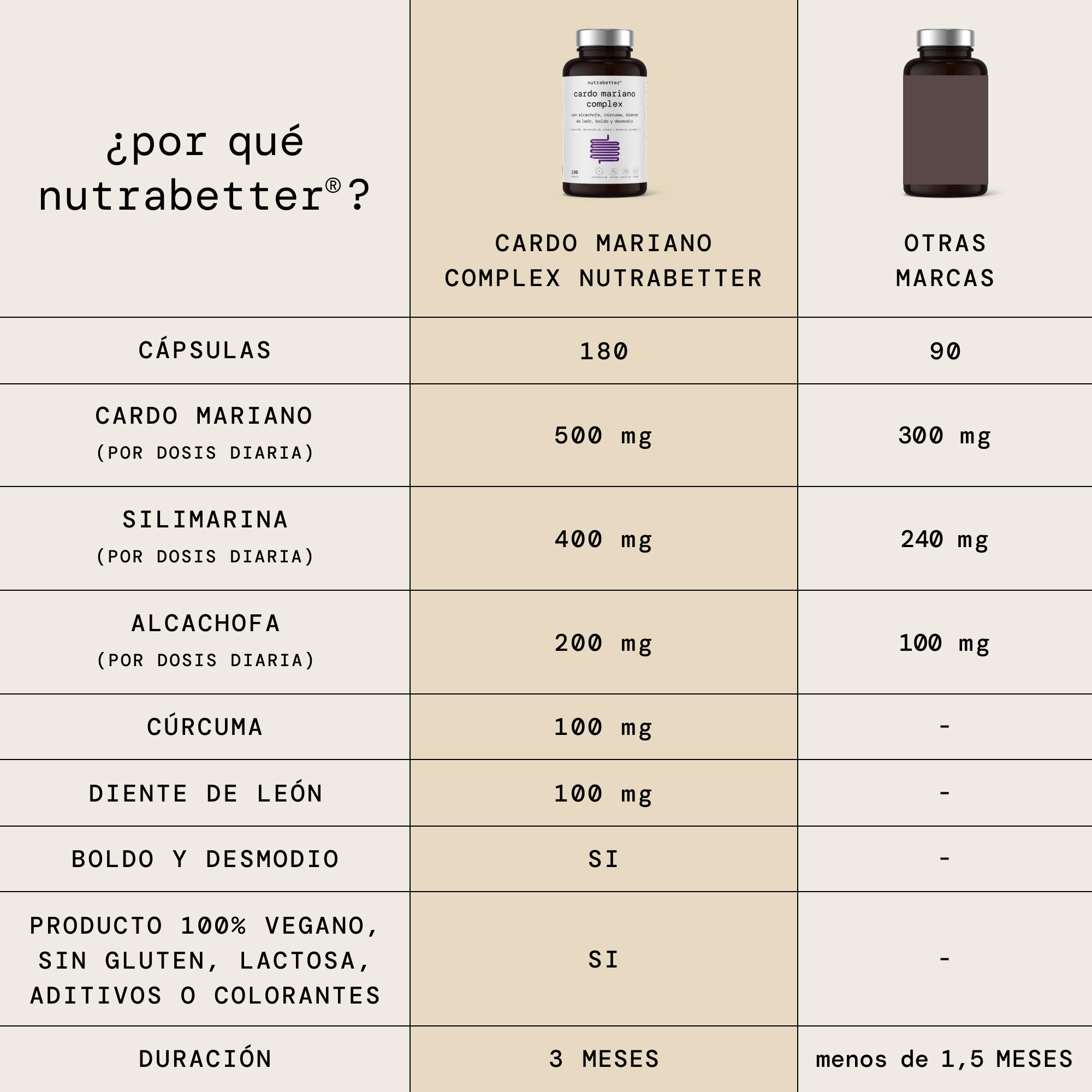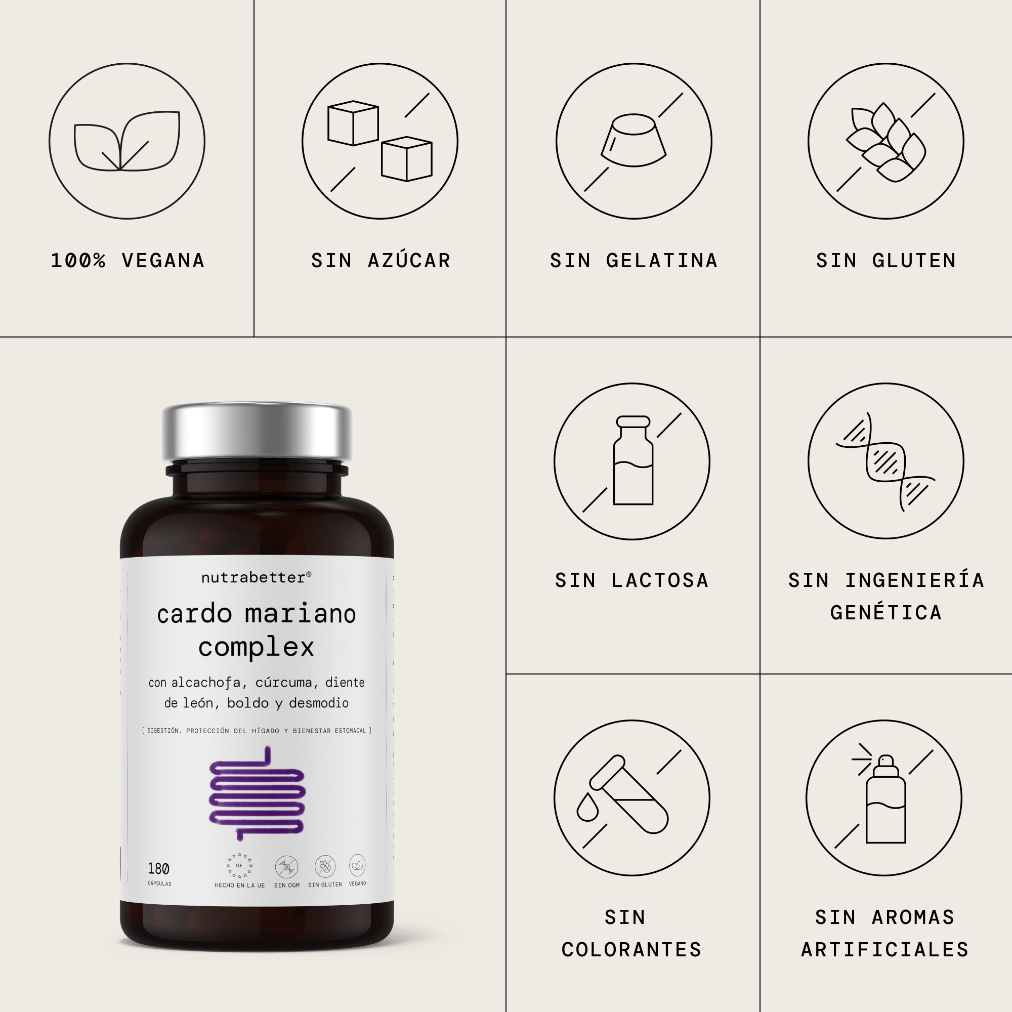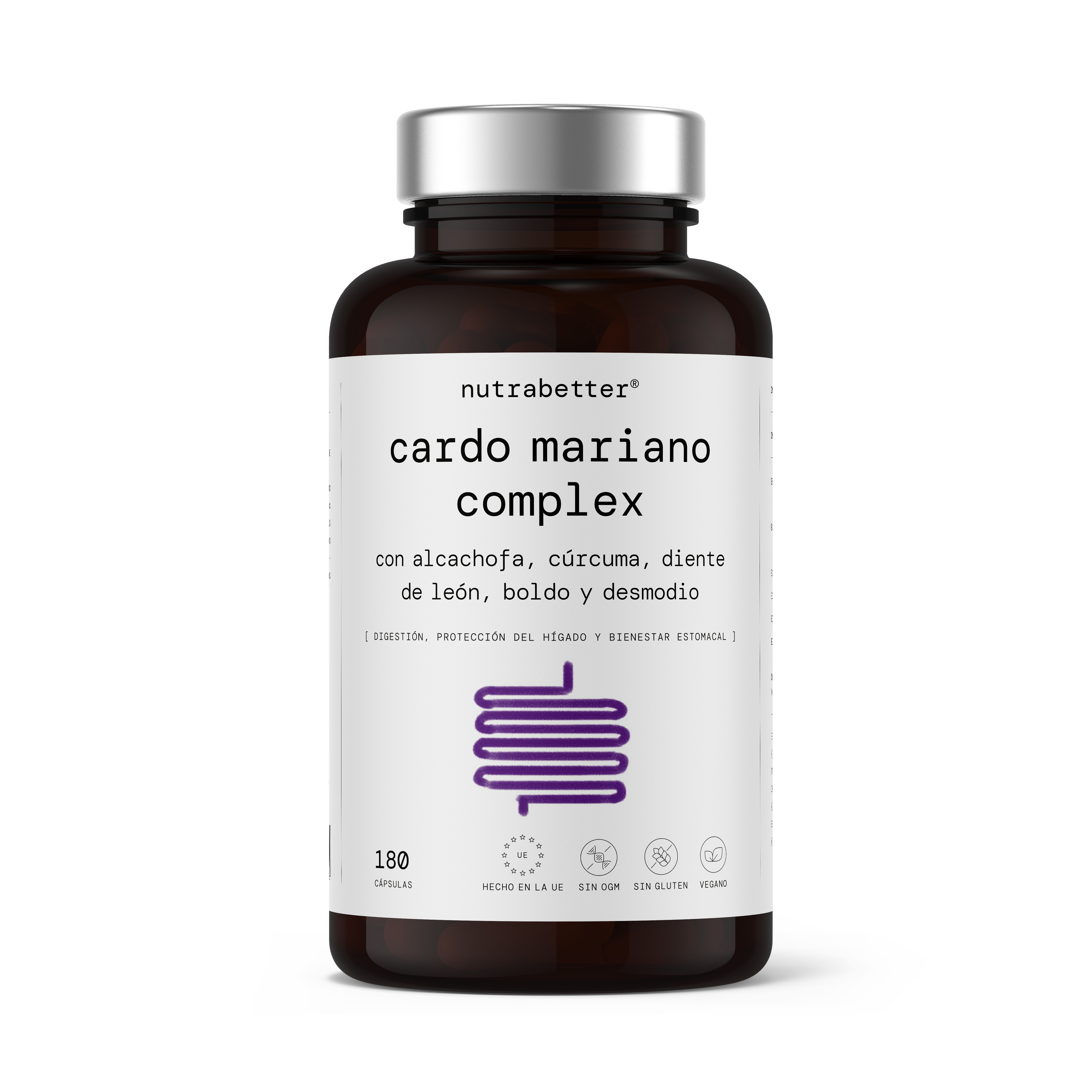 Nutrabetter's natural milk thistle is a capsule for the liver that works as a purifying detox. Each dose provides a high concentration of 500 mg of Milk Thistle with 80% Silymarin, 200 mg of Artichoke Extract, 100 mg of Turmeric, 100 mg of Dandelion, Boldo and Desmodium. This formulation helps improve digestion, promotes the elimination of gases, liquid retention, toxins and the disappearance of stomach pain.