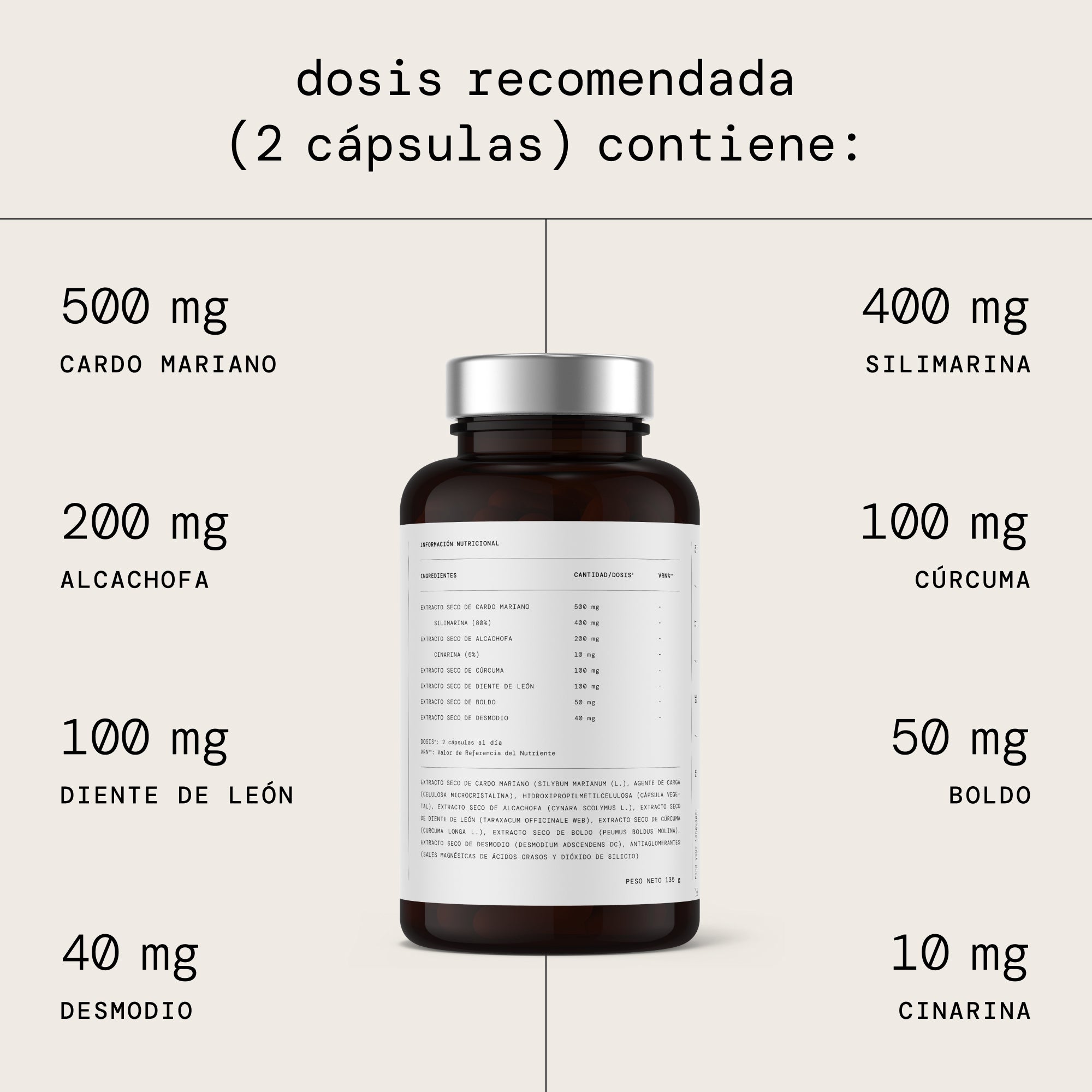 Milk thistle dry extract (Silybum marianum (L.), Bulking agent (Microcrystalline cellulose), Hydroxypropyl methylcellulose (Vegetable capsule), Artichoke dry extract (Cynara scolymus L.), Dandelion dry extract (Taraxacum officinale Web), Turmeric dry extract (Curcuma longa L.), Boldo dry extract (Peumus boldus Molina), Desmodium dry extract (Desmodium adscendens DC), Anti-caking agents (Magnesium salts of fatty acids and Silicon dioxide).