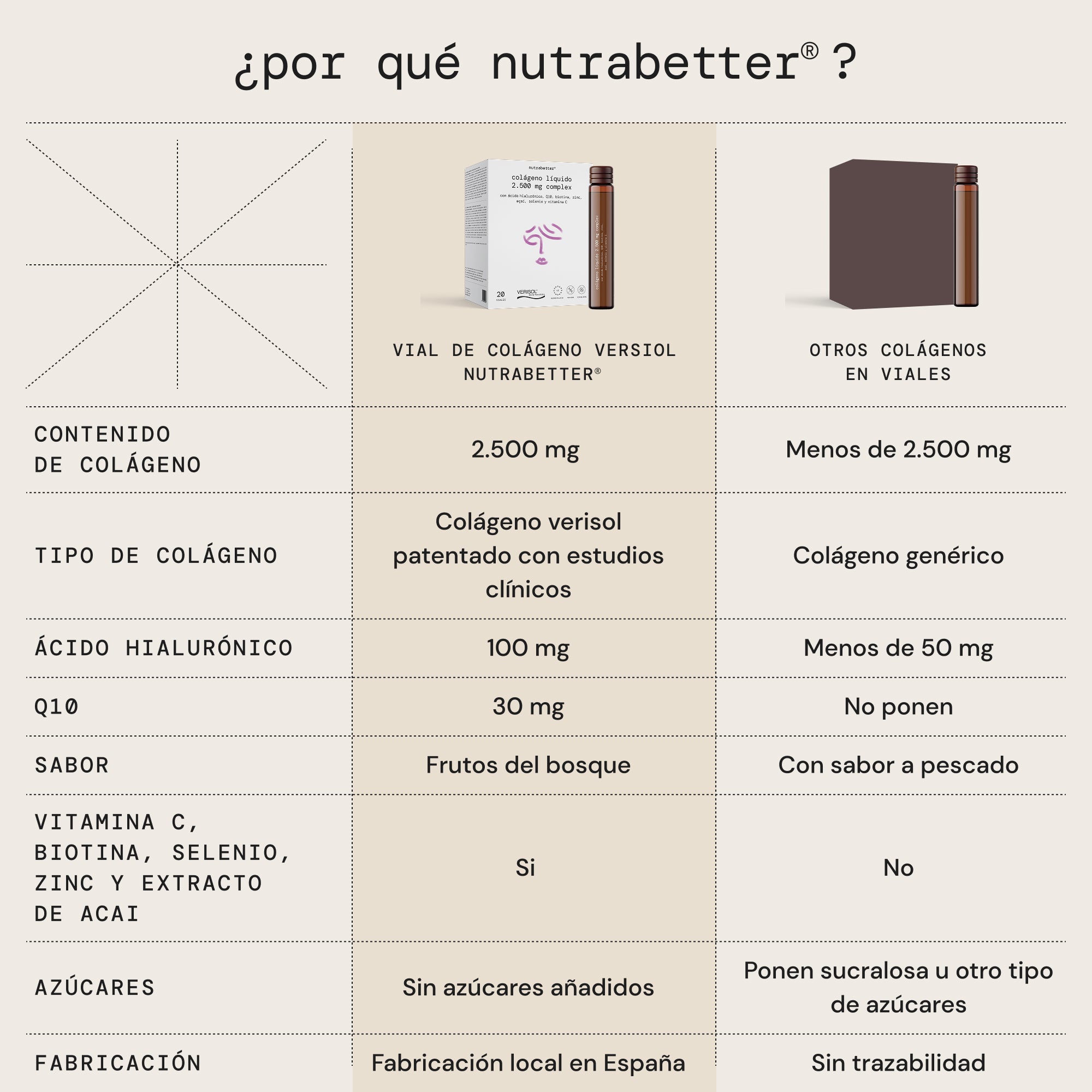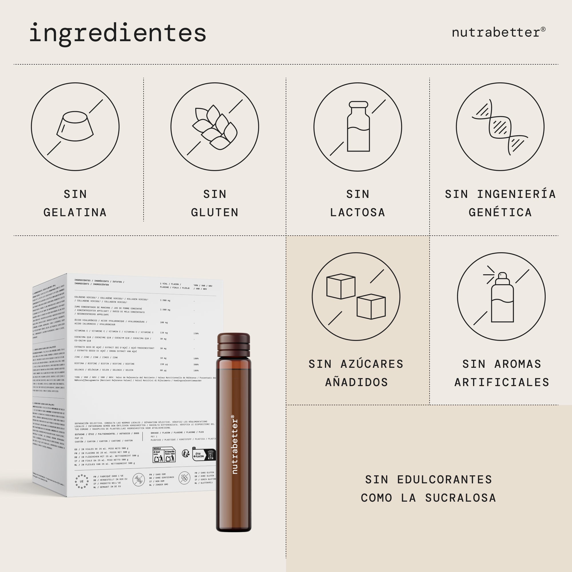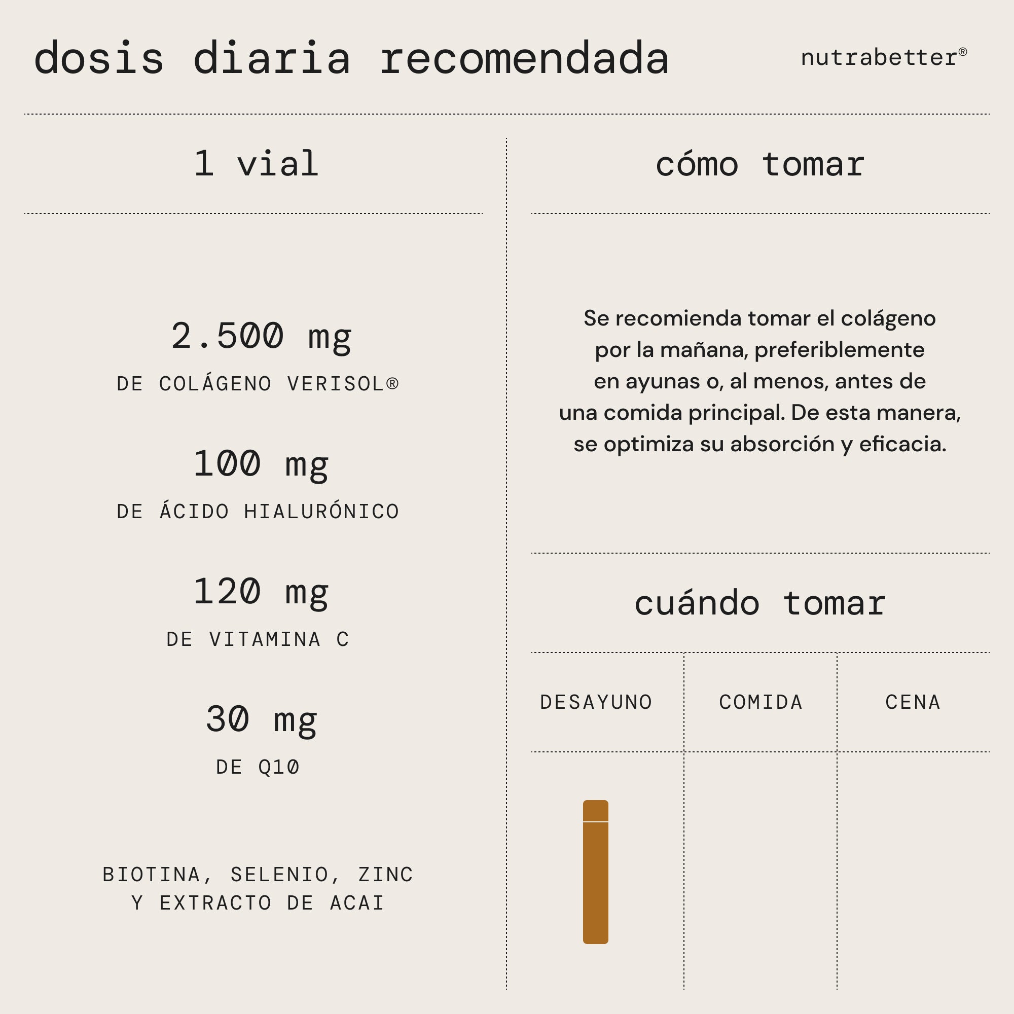 Cada dosis diaria de colágeno bebible (1 vial) aporta 2500 mg de colágeno Verisol que es equivaliente a 5 veces más de colágeno que el formato cápsulas. Además lleva 100 mg de ácido hialurónico, garantizando una alta concentración de ingredientes activos para resultados óptimos y visibles
