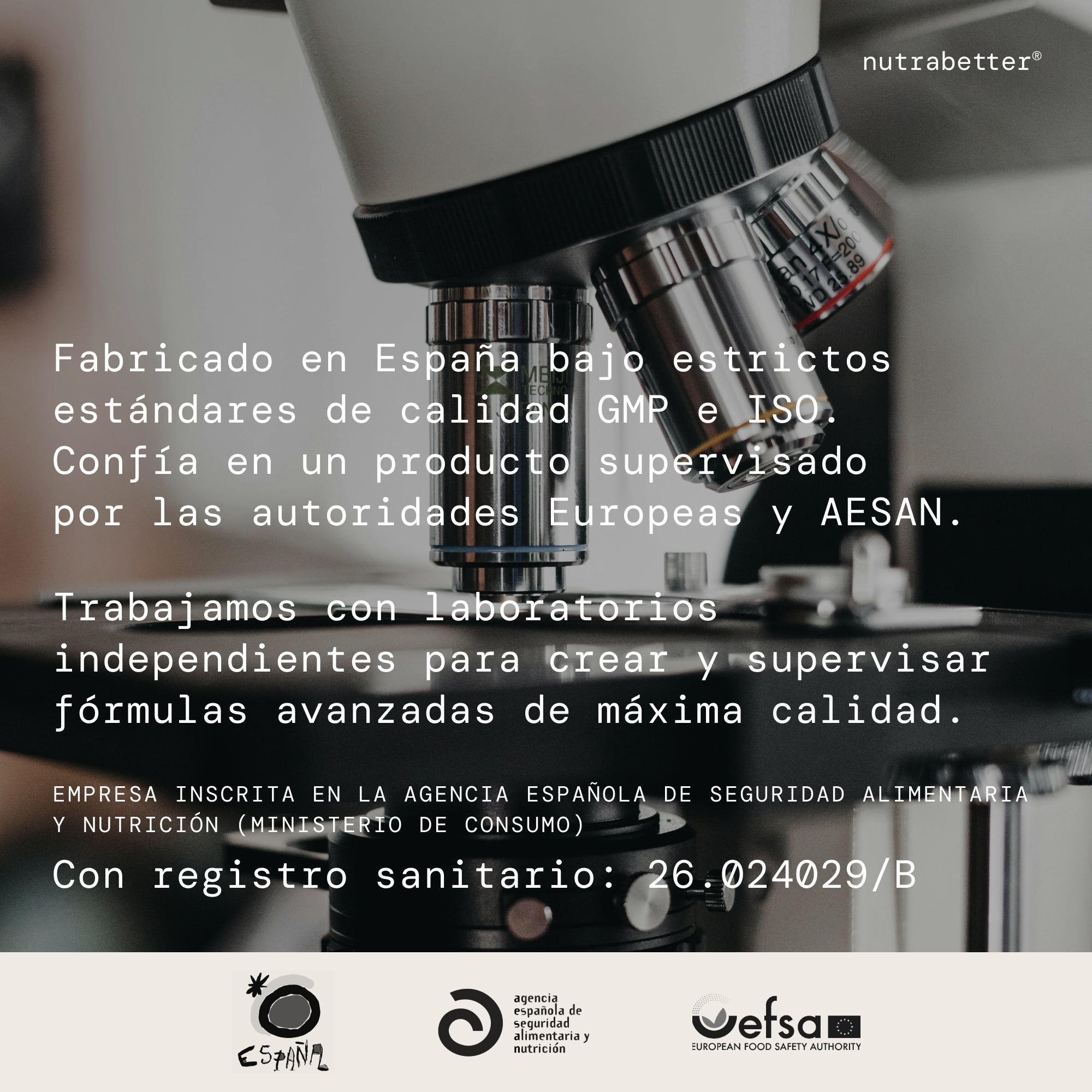 Fabricado en España bajo estrictos estándares de calidad GMP e ISO, con ingredientes de la más alta calidad y supervisión de las autoridades Europeas asegurando un producto confiable y seguro. Nuestra empresa NUTRAHEALTH EUROPE está inscrita en la Agencia Española de Seguridad Alimentaria y Nutrición (Ministerio de consumo) con registro sanitario: 26.024029/B.