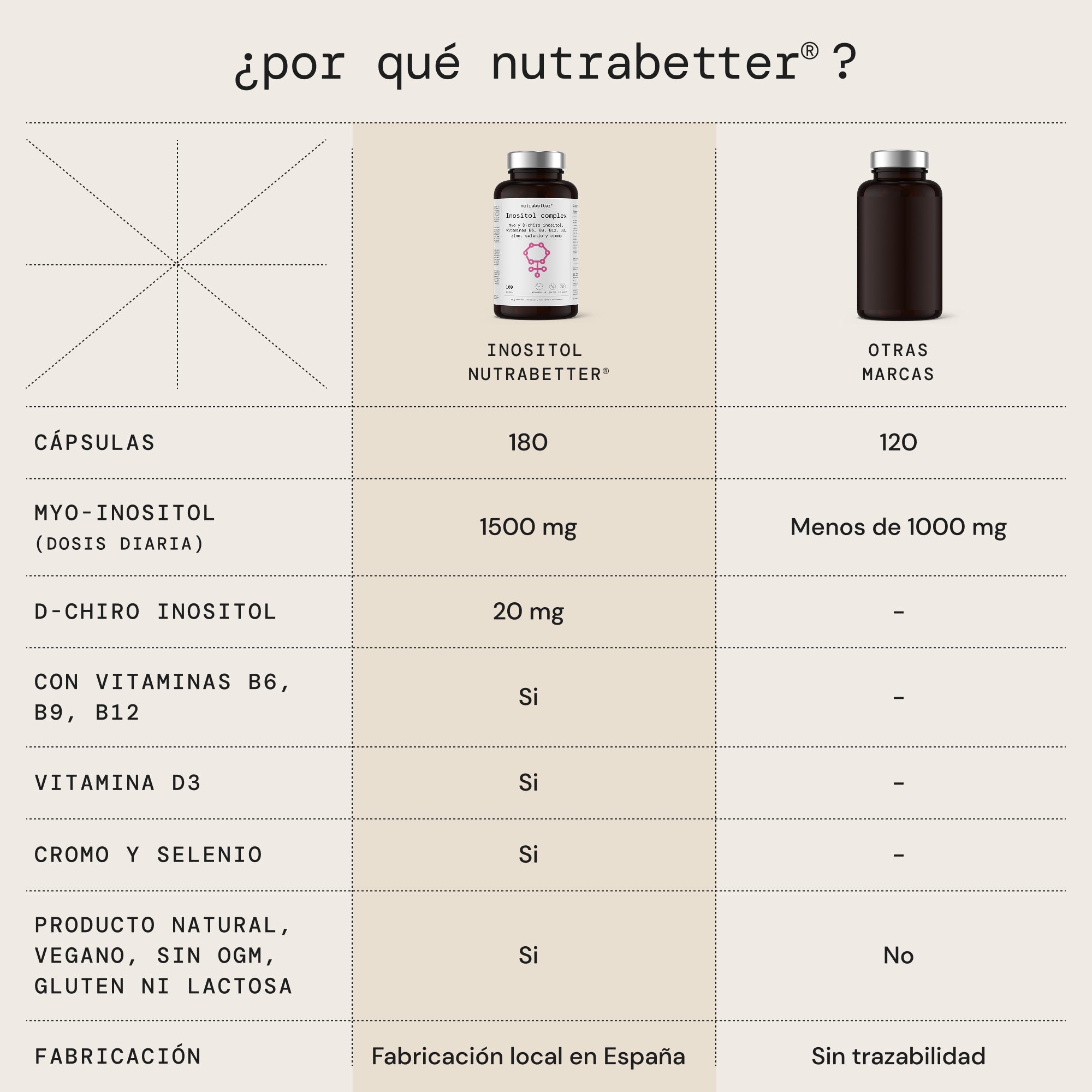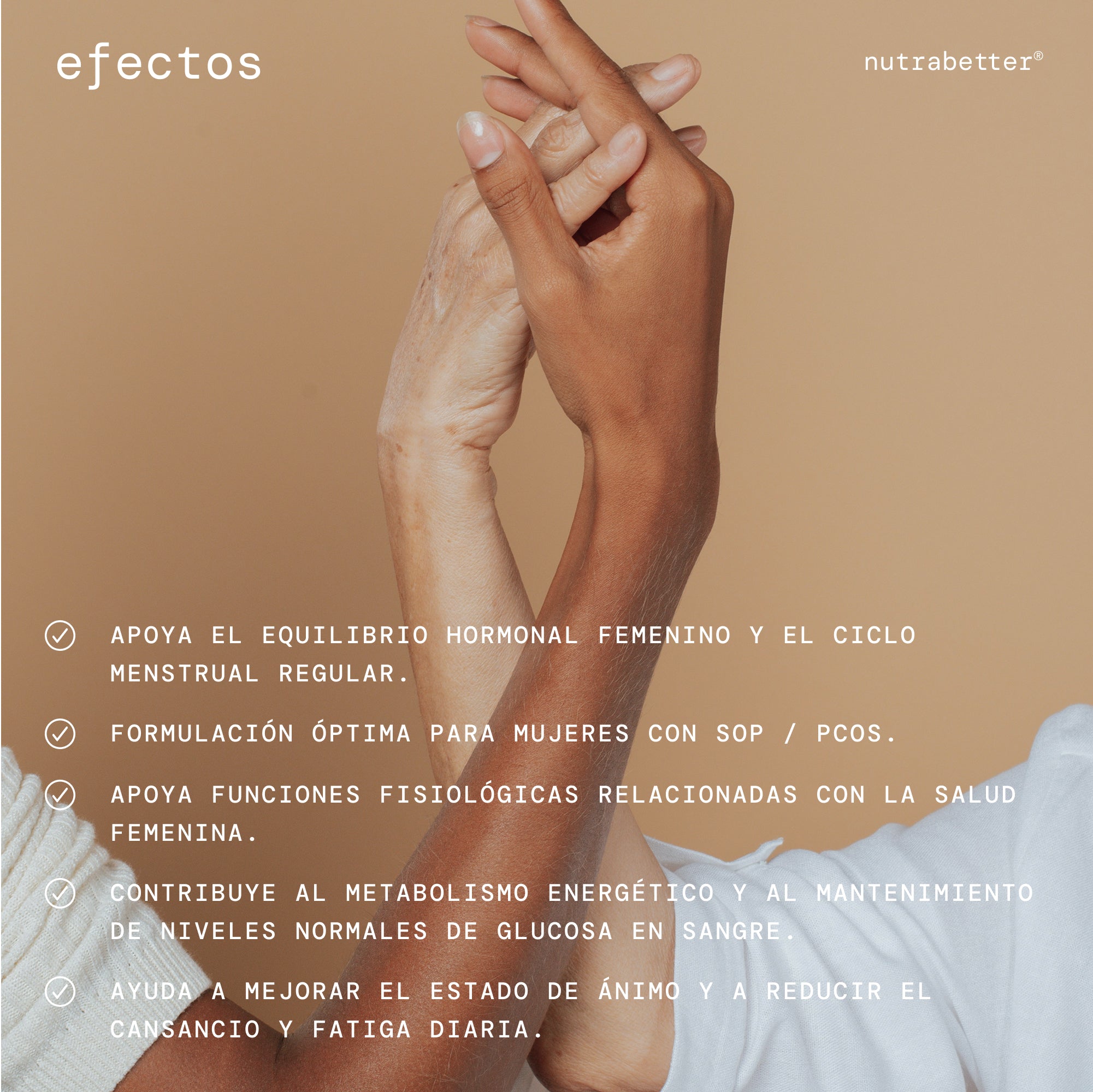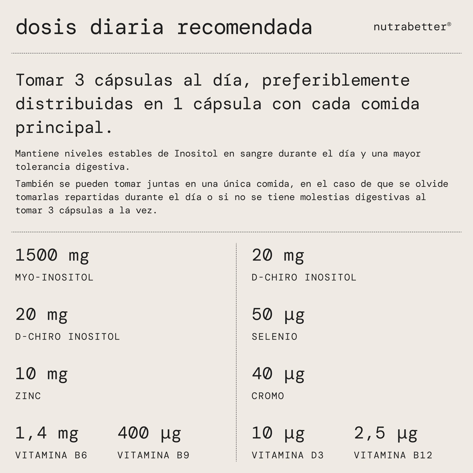 Cada dosis diaria (3 cápsulas) aporta 1500 mg de Myo-Inositol y 20 mg de D-Chiro, junto con Zinc, Cromo, B6, B9 (ácido fólico), B12, D3 y Selenio para un bienestar femenino integral.