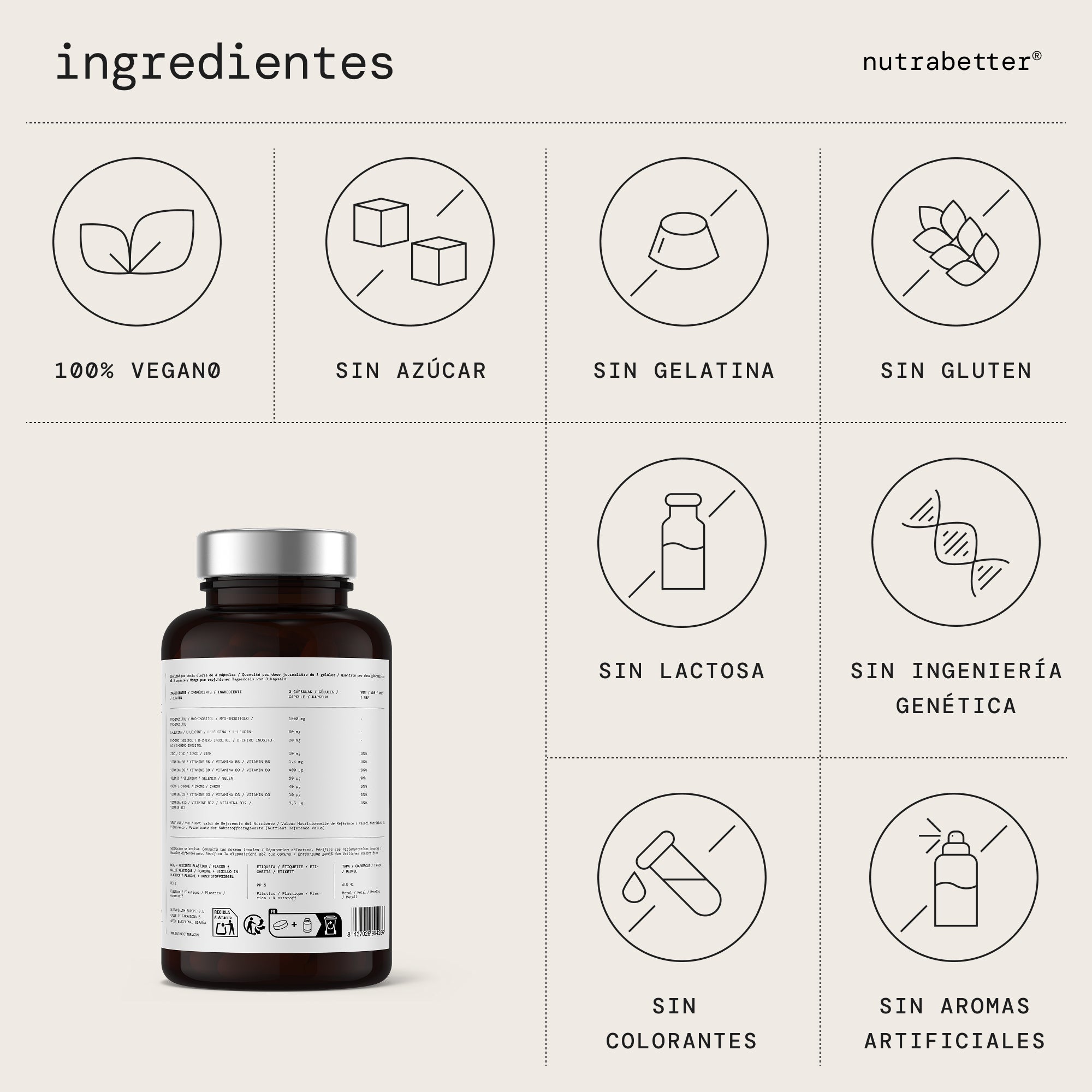 Sin gluten, lactosa ni alérgenos, fabricado en España bajo estándares GMP e ISO, libre de estearatos y aditivos innecesarios.