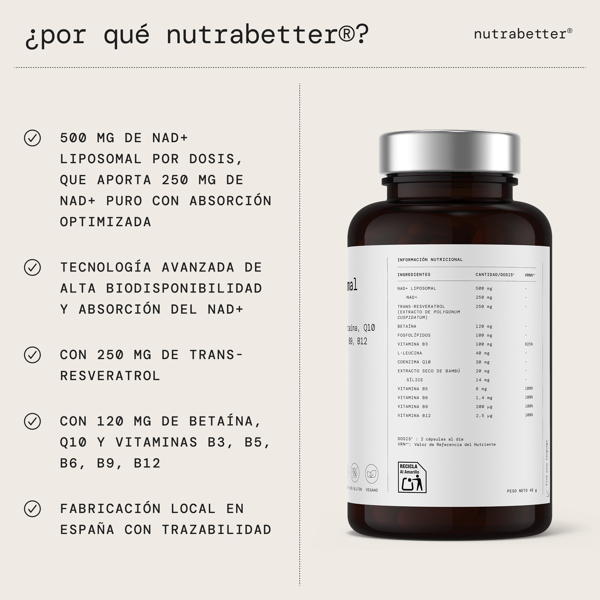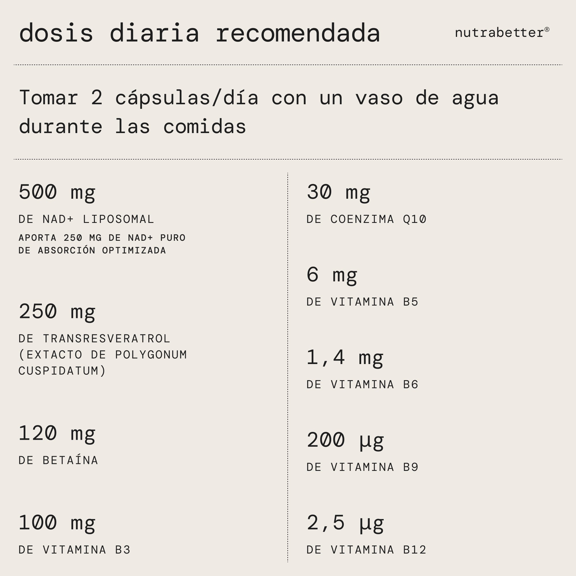 Cada dosis diaria proporciona más de 1000 mg de ingredientes activos: 500 mg de NAD+ Liposomal, 250 mg de Trans-Resveratrol (98%), junto con 120 mg de Betaína HCl, vitaminas B3, B5, B6, B9 y B12. Una sinergia diseñada para apoyar la longevidad, la energía mitocondrial y el bienestar general.