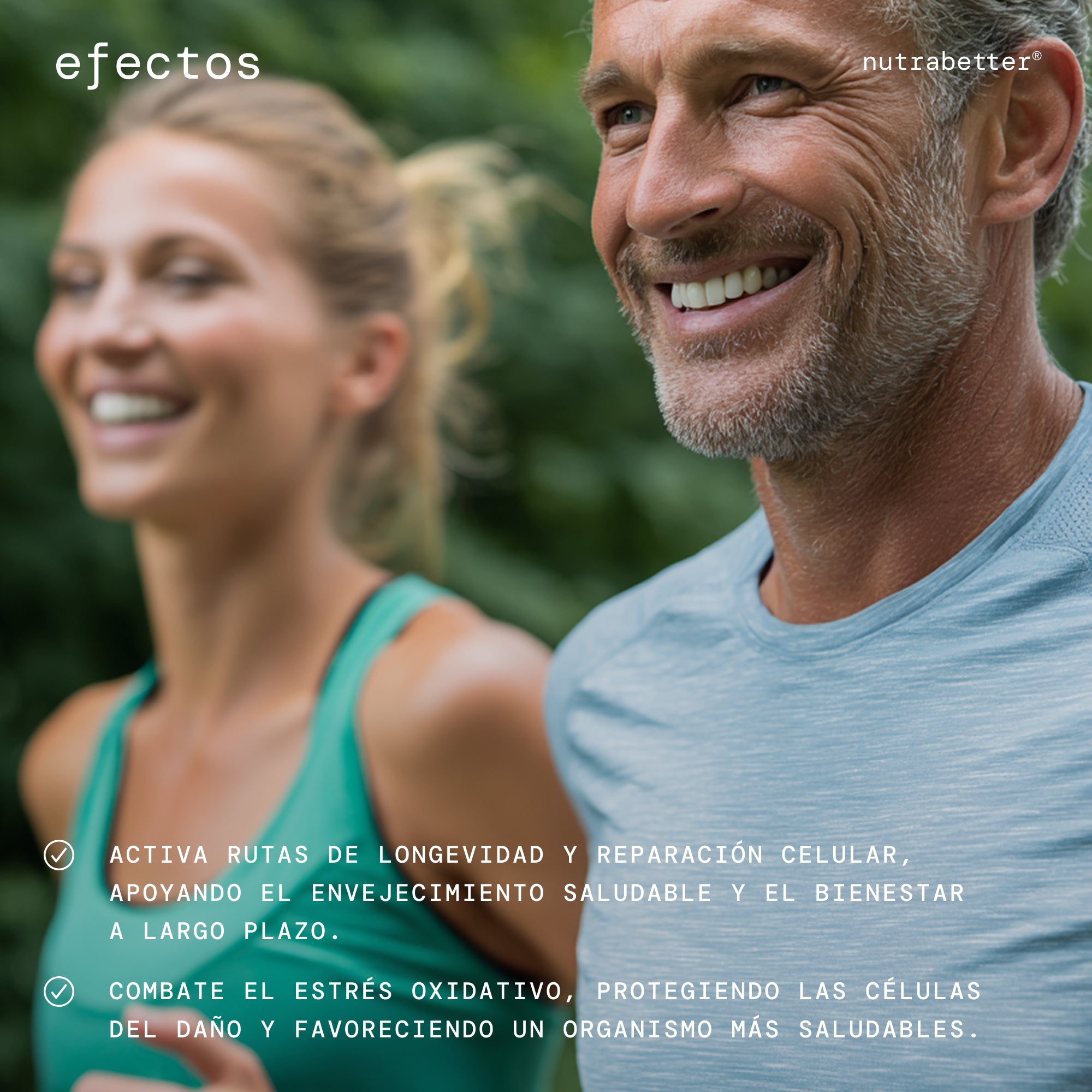 Trans-resveratrol (procede de extracto seco de hierba nudosa japonesa: polygonum cuspidatum), nicotinamida adenina dinucleótido liposomal (nad+), cápsula vegetal (hidroxipropilmetilcelulosa, carbonato de calcio), fosfolípidos, betaína hcl, agente de carga (celulosa microcristalina), niacina (nicotinamida), l-leucina, coenzima q10, extracto seco de bambú (bambusa arundinacea (retz.) willd.), emulgente (glicerol), ácidos grasos, ácido pantoténico (d-pantotenato cálcico), vitamina b6 (clorhidrato de piridoxina), ácido fólico (ácido pteroilmonoglutámico), vitamina b12 (cianocobalamina).