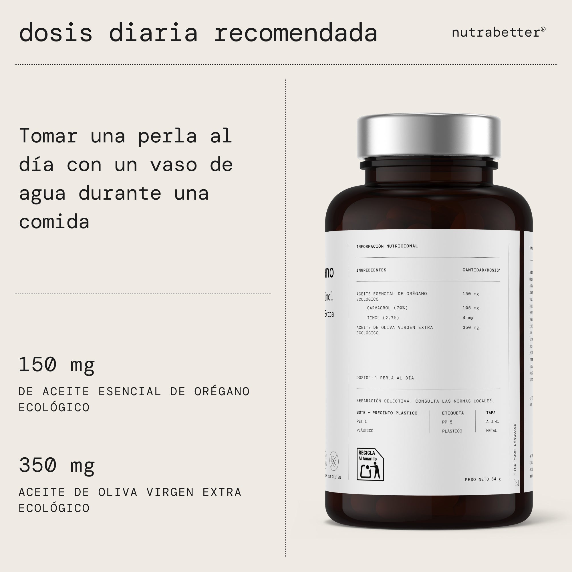 Aceite de orégano cápsulas blandas formuladas con 150 mg de aceite esencial de orégano por cápsula, estandarizado al 80 % de carvacrol (120 mg) y 2,7 % de timol (4 mg). Una fórmula concentrada de aceite de orégano con carvacrol, clara y transparente.