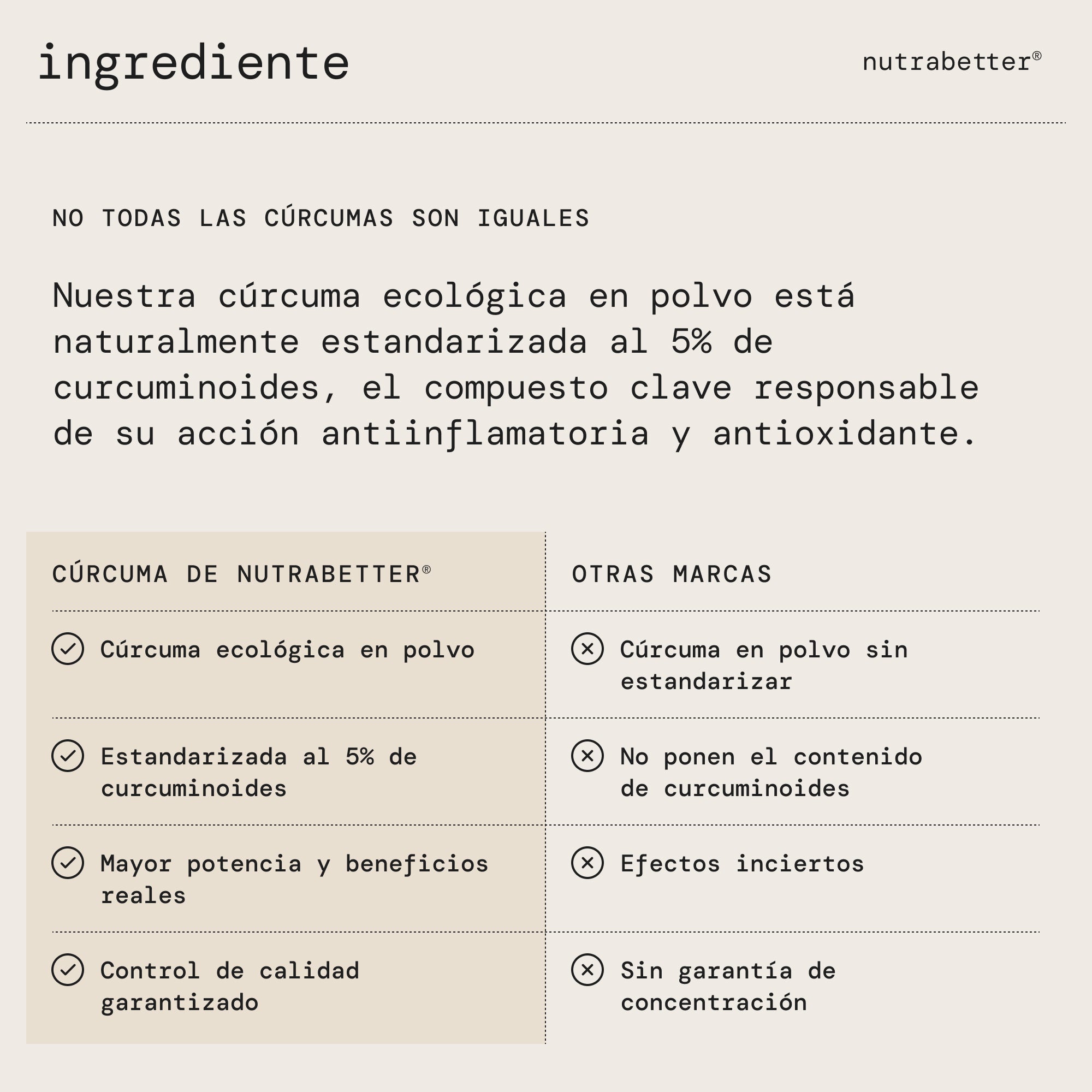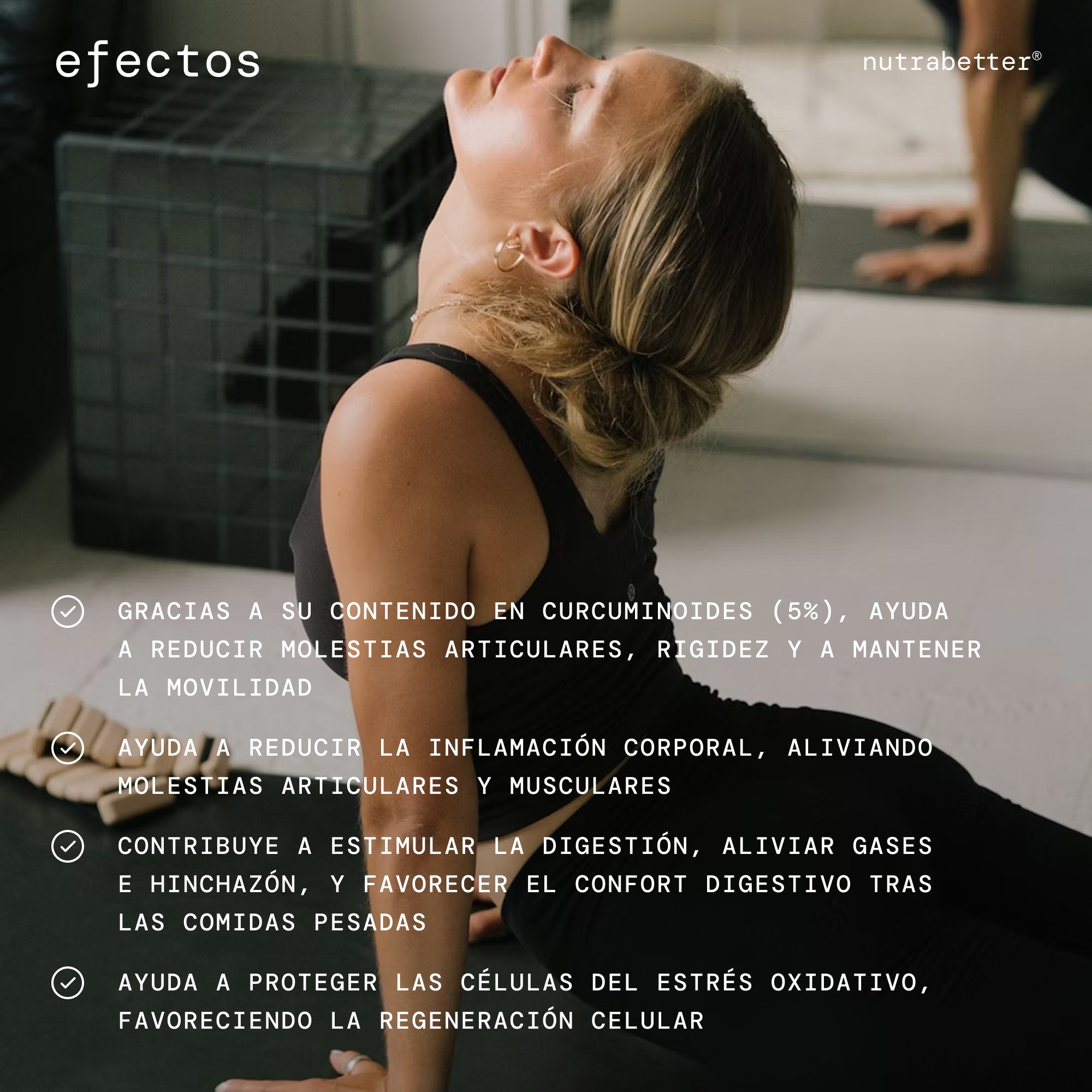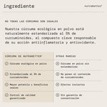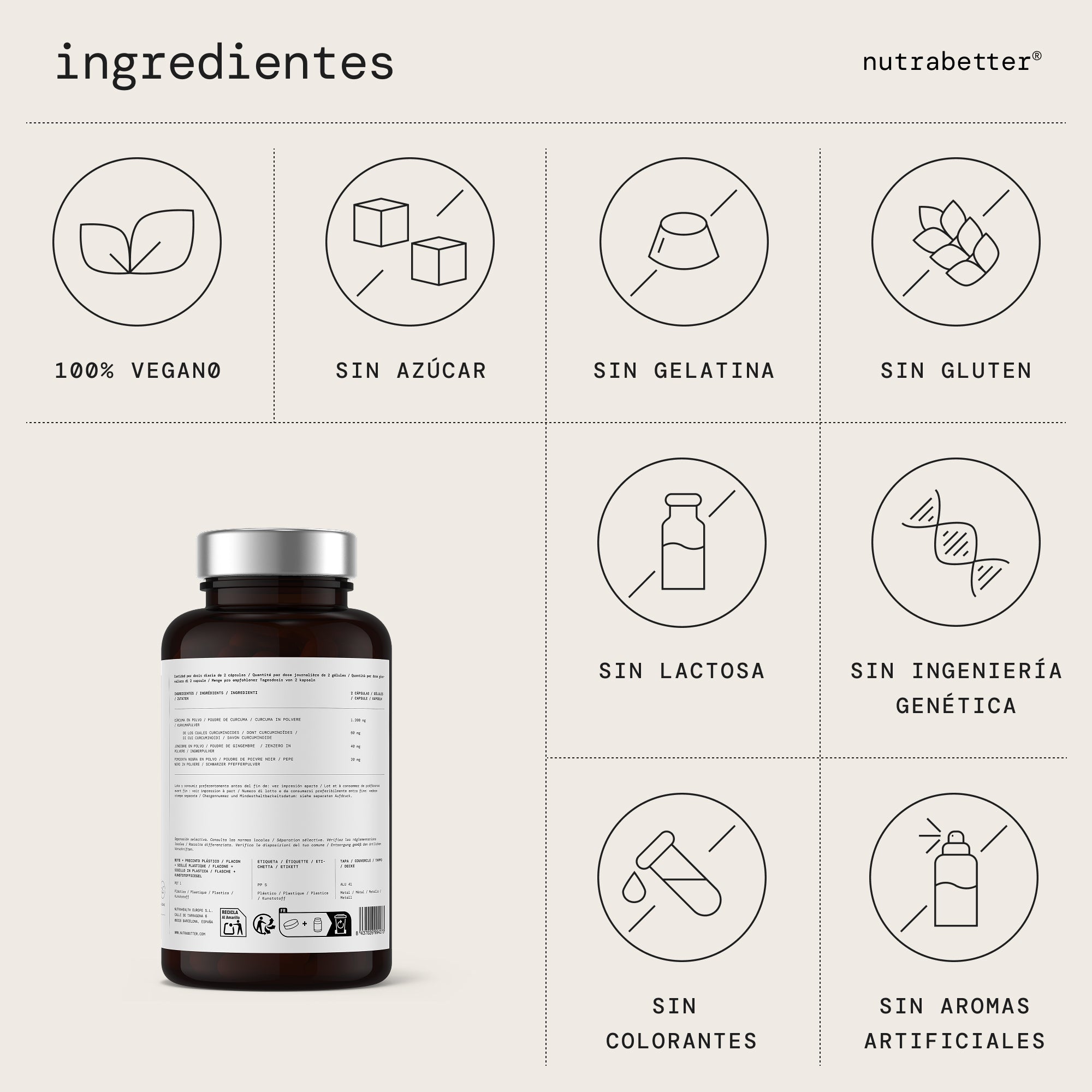 Cúrcuma en polvo (curcuma longa l., rizoma), cápsula vegetal (hidroxipropilmetilcelulosa, carbonato de calcio), jengibre en polvo (zingiber officinale, rizoma), pimienta negra en polvo (piper nigrum, bayas), harina de arroz.