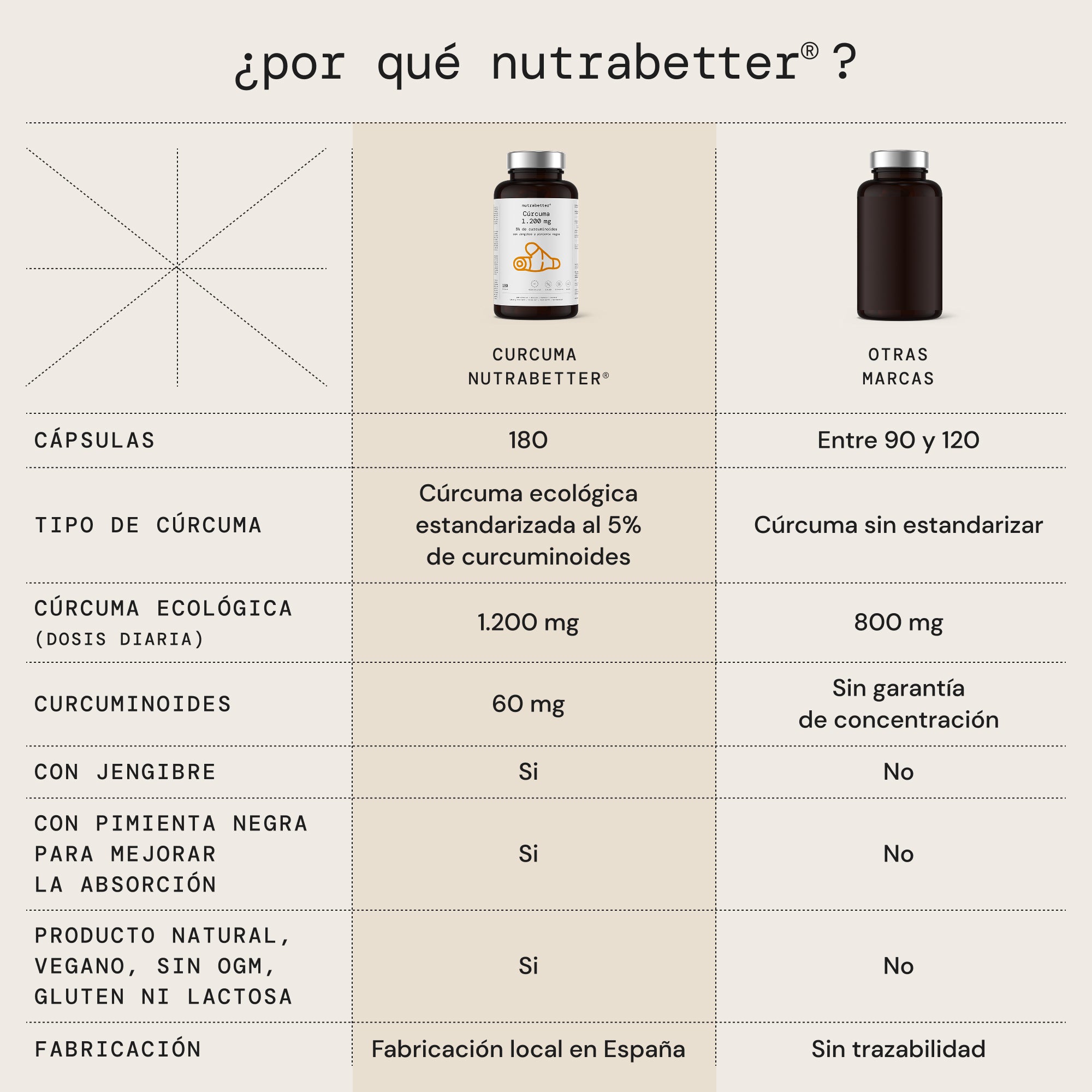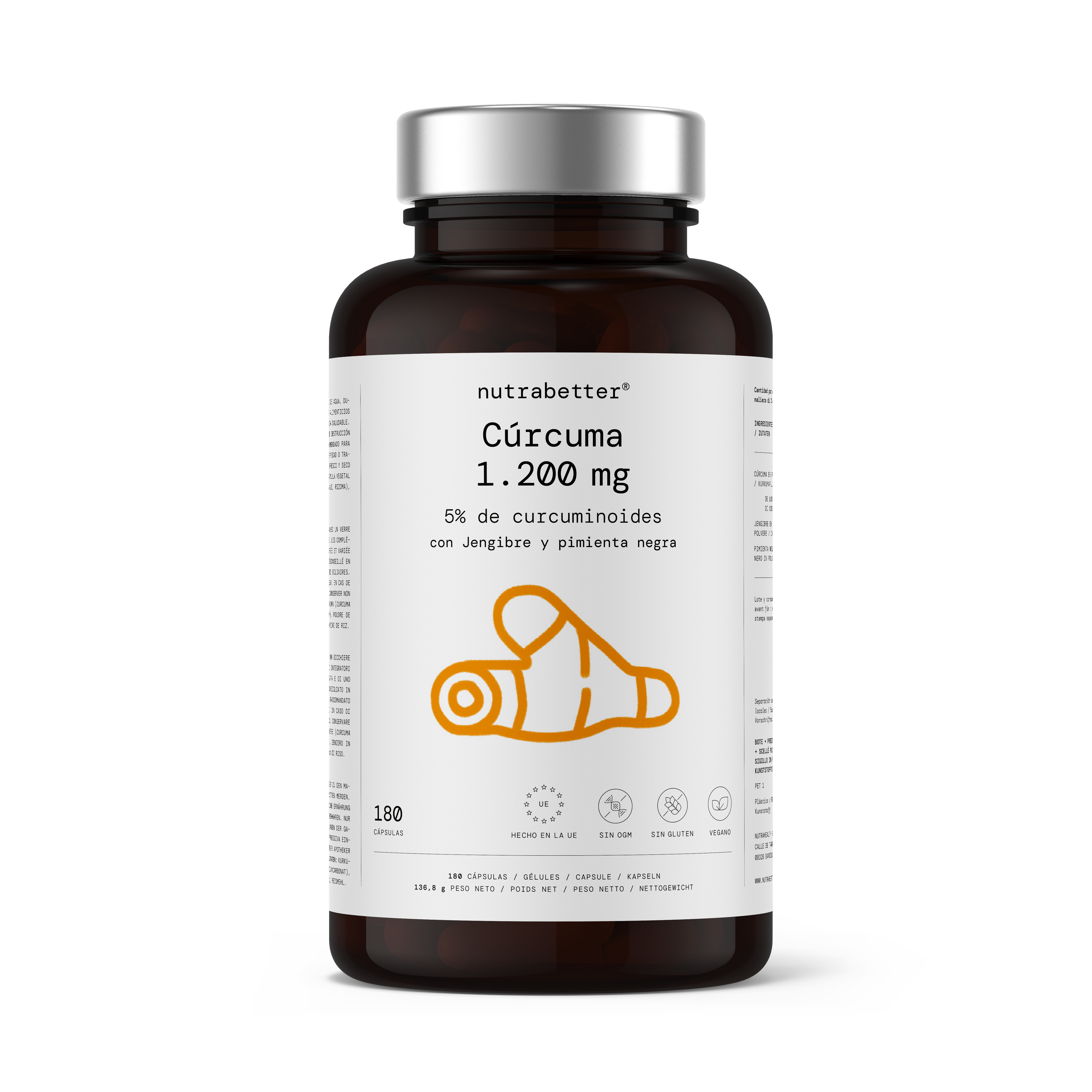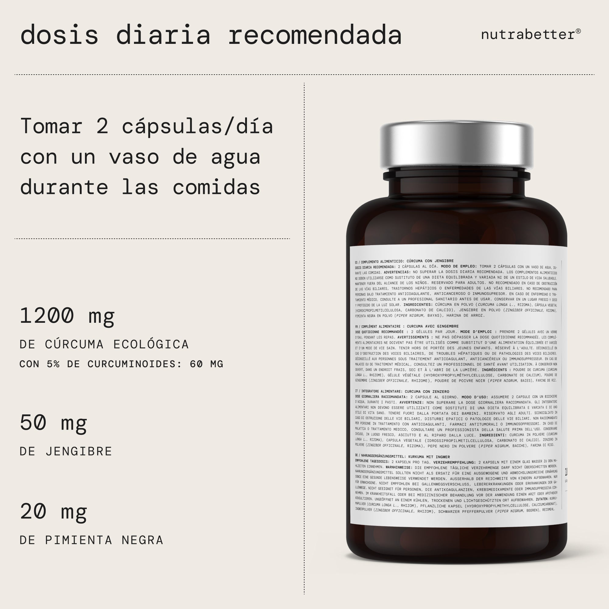 180 cápsulas por bote. Cada dosis diaria Nuestra fórmula combina 1.200 mg de cúrcuma en polvo de alta calidad (concentrada al 5% en curcuminoides, 60 mg por dosis), junto con jengibre en polvo y pimienta negra. El jengibre potencia los efectos digestivos y antioxidantes, mientras que la pimienta negra mejora la absorción de la cúrcuma.