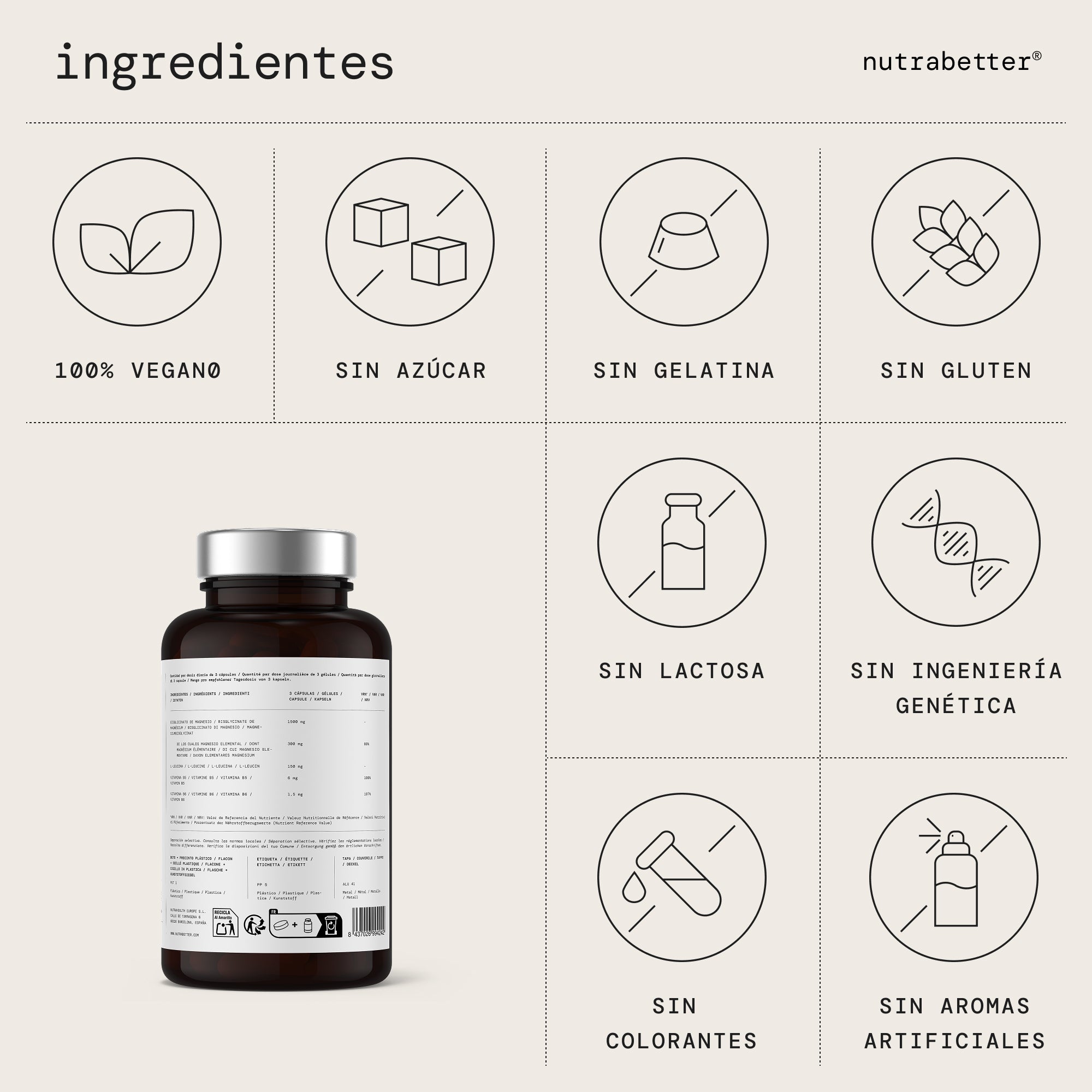 Sin gluten, sin lactosa, sin estearato de magnesio, sin conservantes. Cápsulas vegetales aptas para veganos y elaboradas solo con ingredientes seguros y naturales.