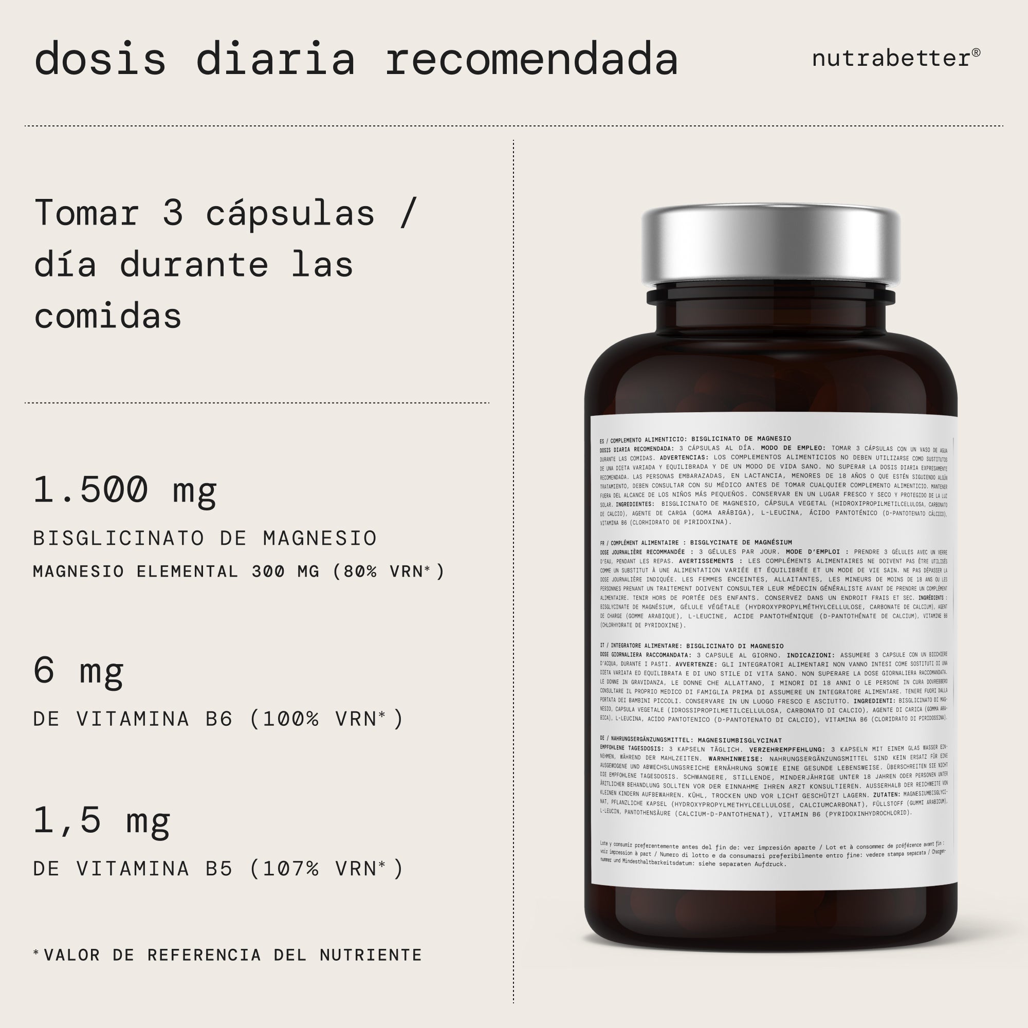 Cada dosis diaria (3 cápsulas) aporta 1500 mg de bisciglinato de magnesio, con 300 mg de magnesio puro. Apoya la función muscular, la salud ósea y el sistema nervioso.