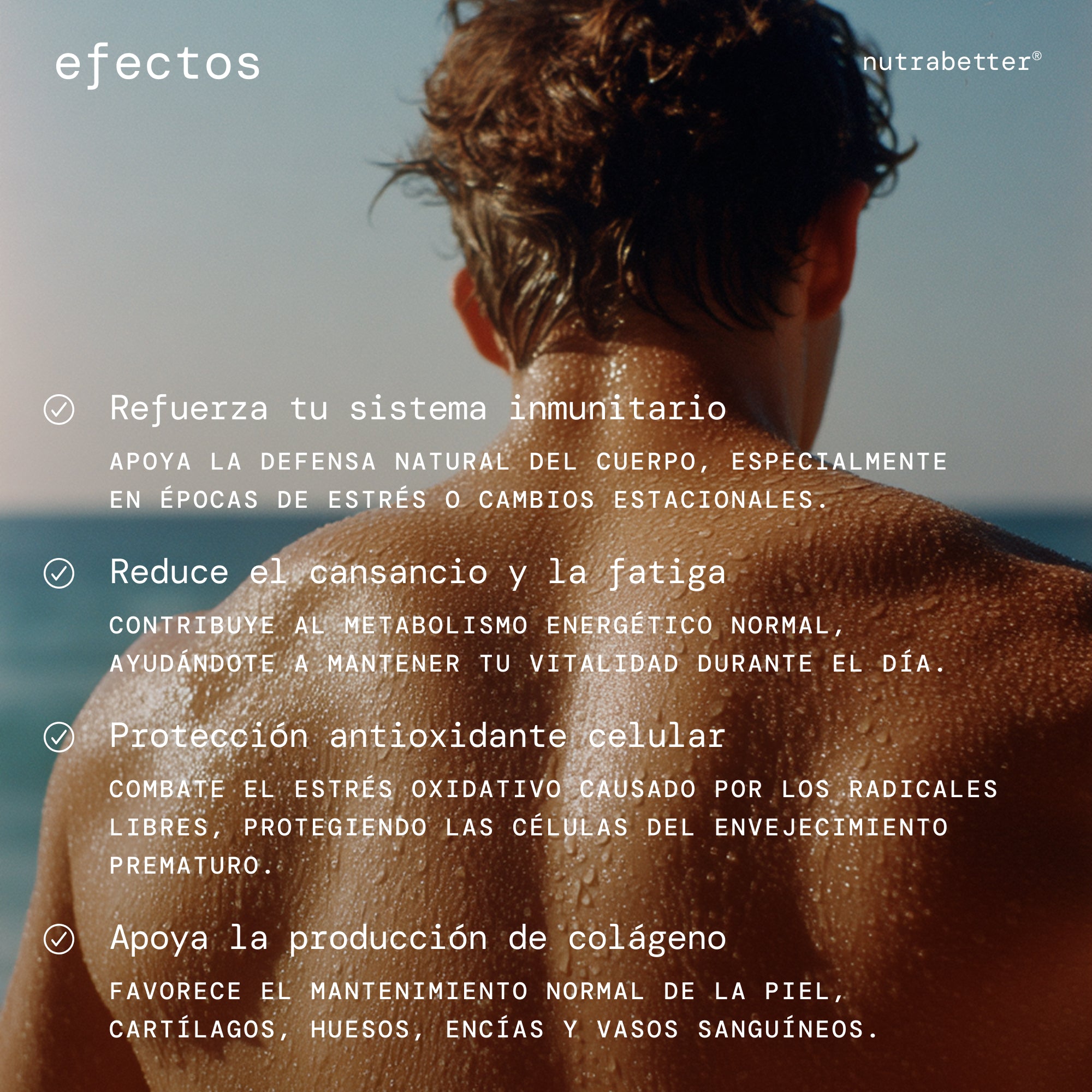 La vitamina C contribuye a proteger las células frente al daño oxidativo, apoyando la salud de la piel, articulaciones, vasos sanguíneos y huesos.
