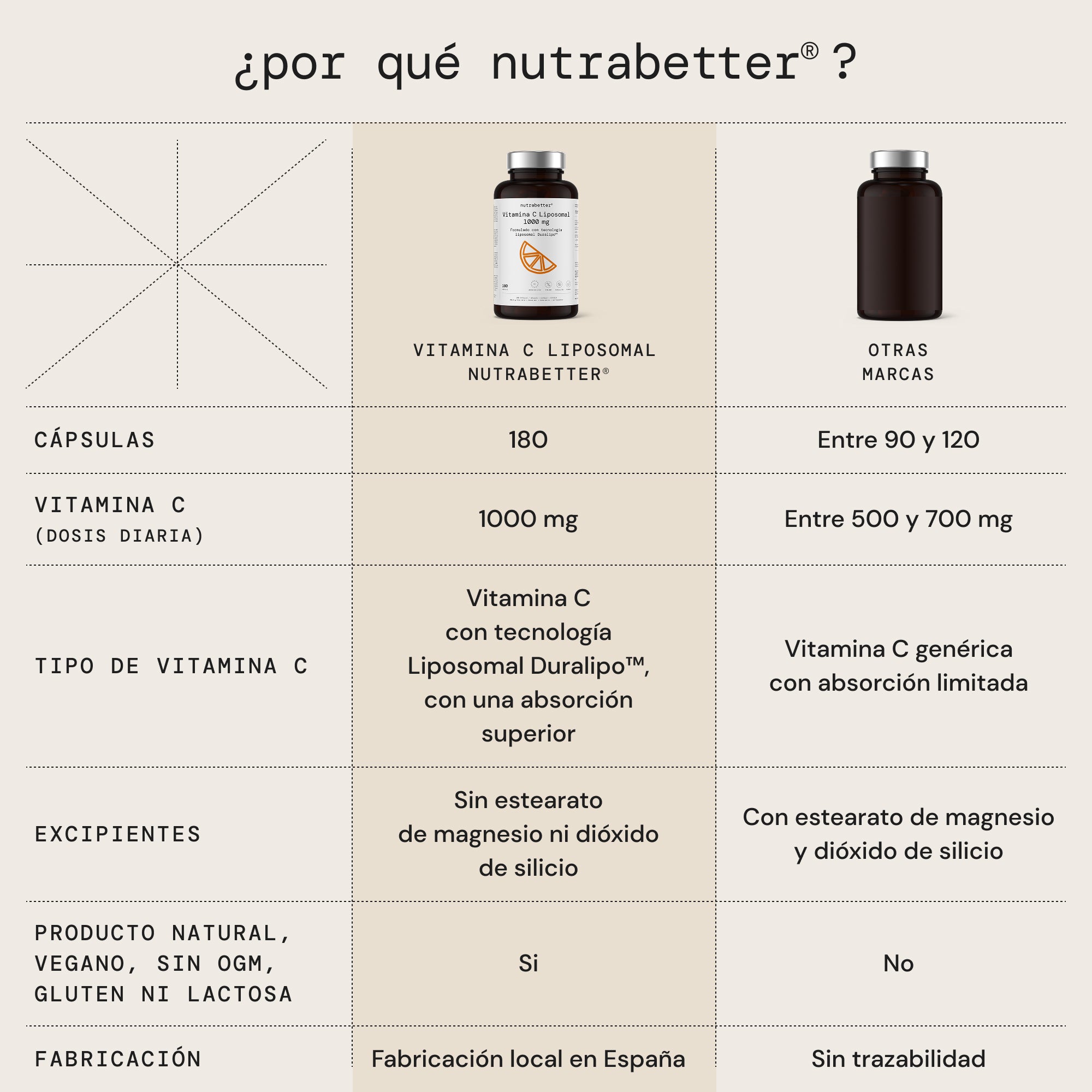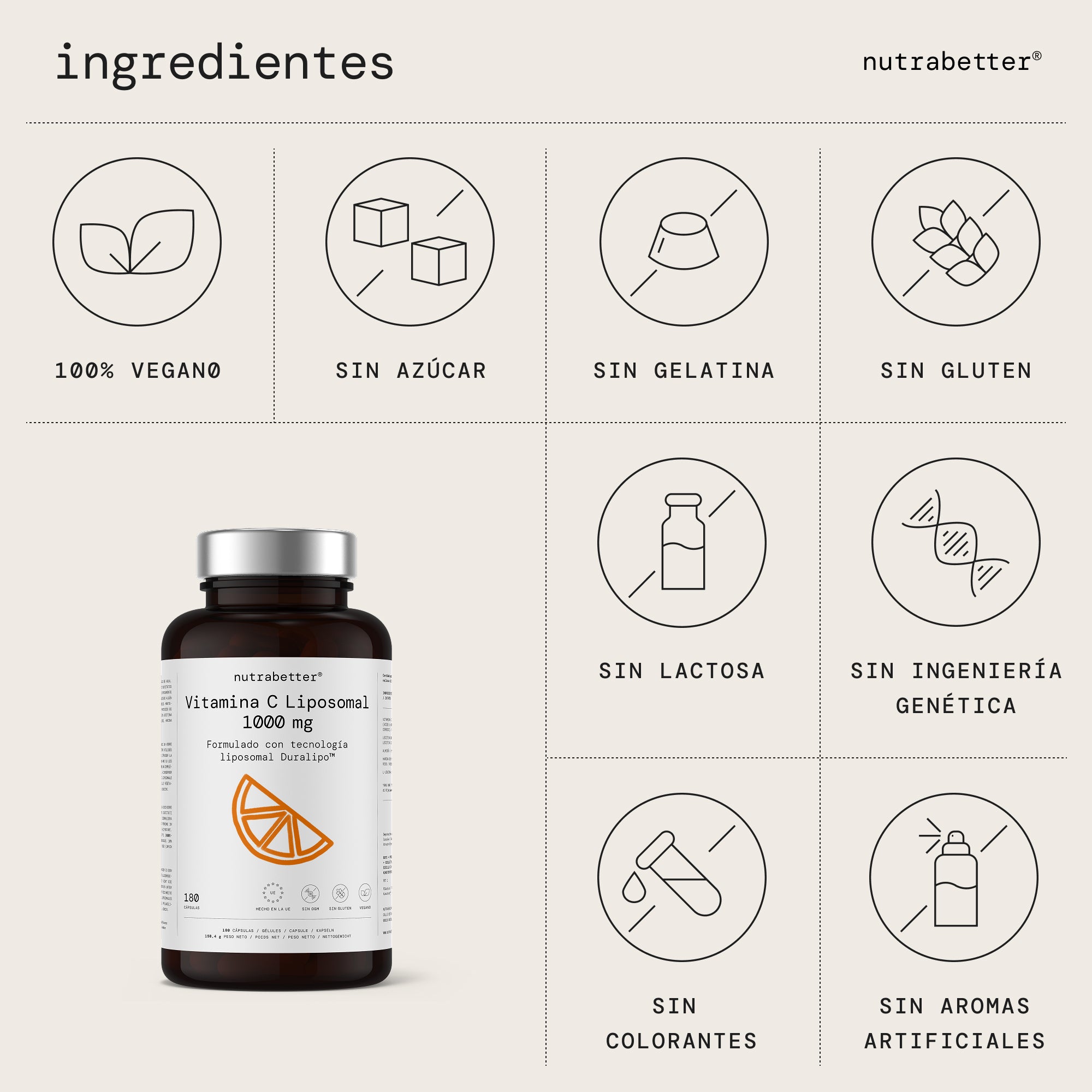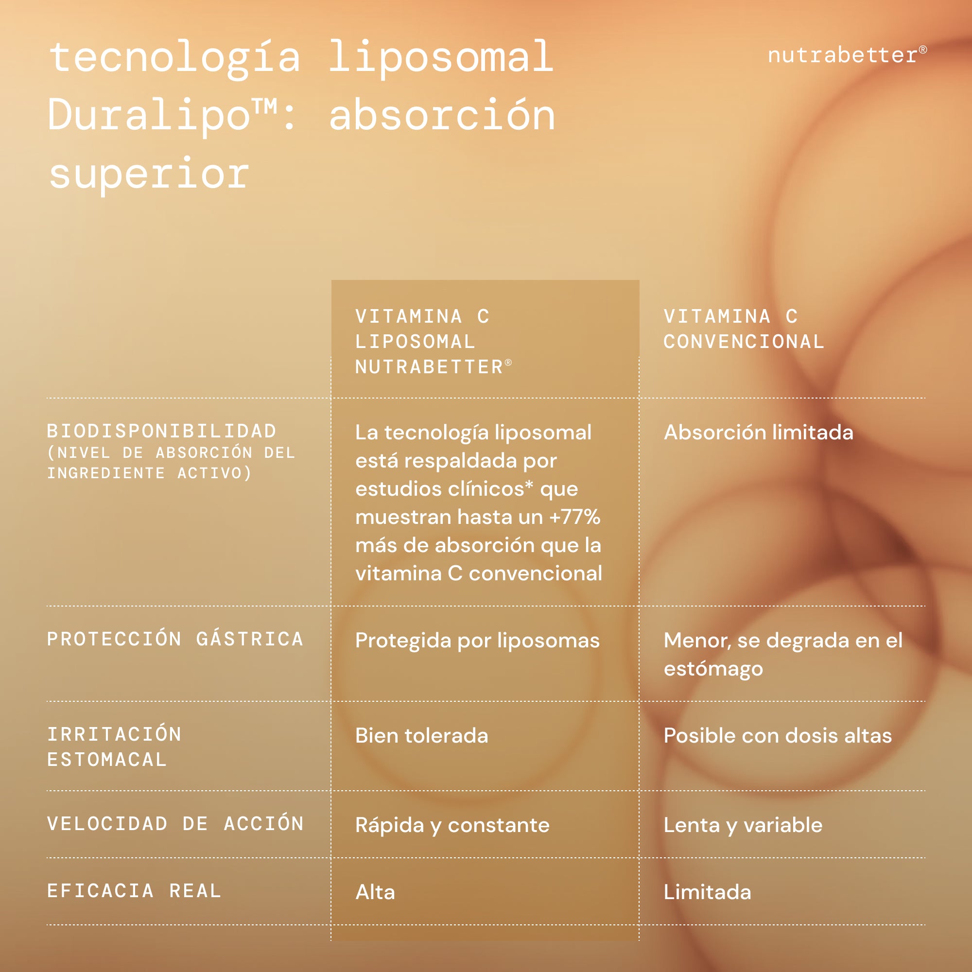 Nuestra vitamina C liposomal 1000mg está formulada con fosfolípidos de lecitina de girasol, lo que mejora significativamente su biodisponibilidad y permite una mejor absorción intestinal frente a la vitamina C tradicional.