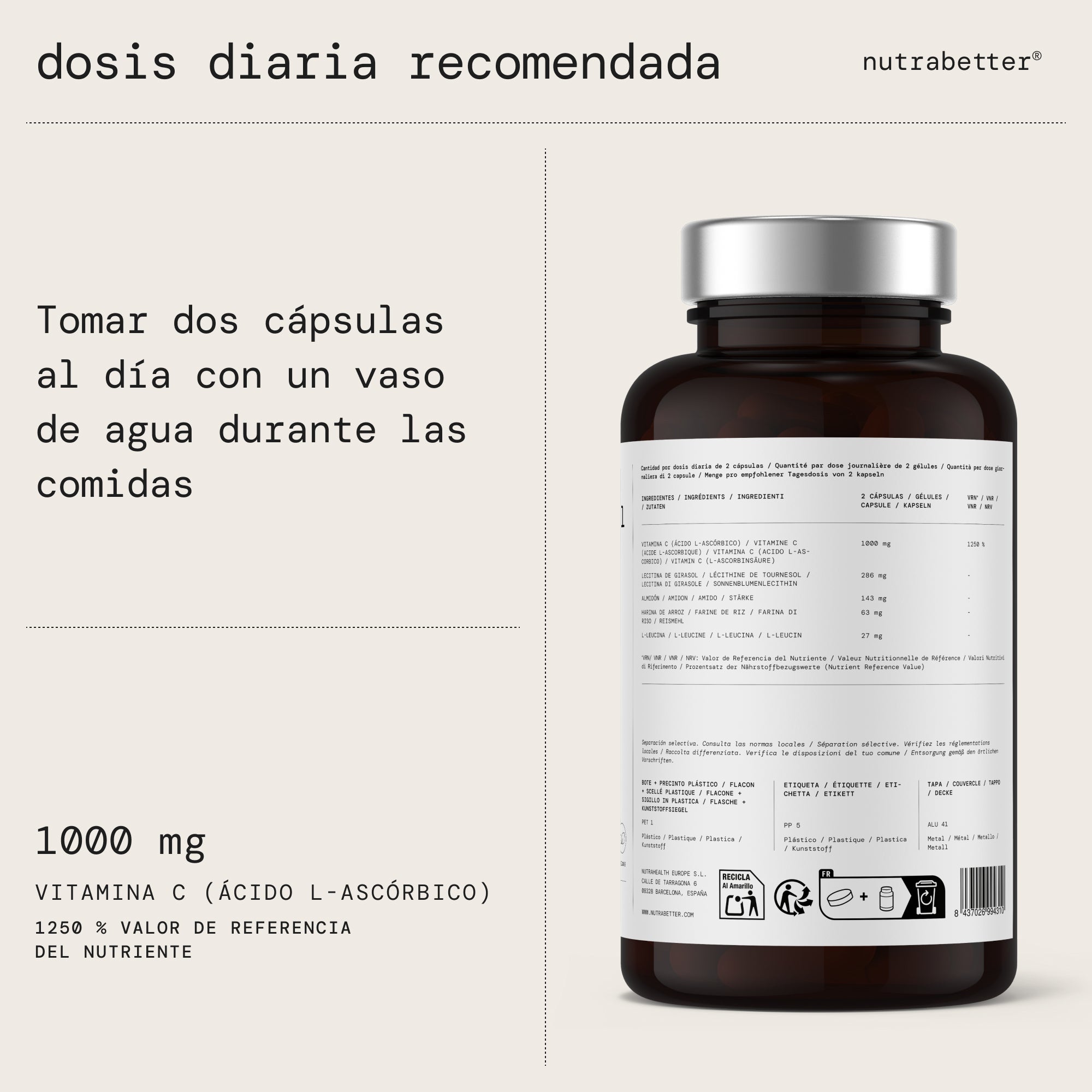 Cada dosis diaria (2 cápsulas) proporciona 1000 mg de vitamina C pura (ácido L-ascórbico), ayudando a reforzar el sistema inmunitario, disminuir el cansancio y la fatiga y contribuir a la producción de colágeno. 180 cápsulas veganas para un suministro de 3 meses.