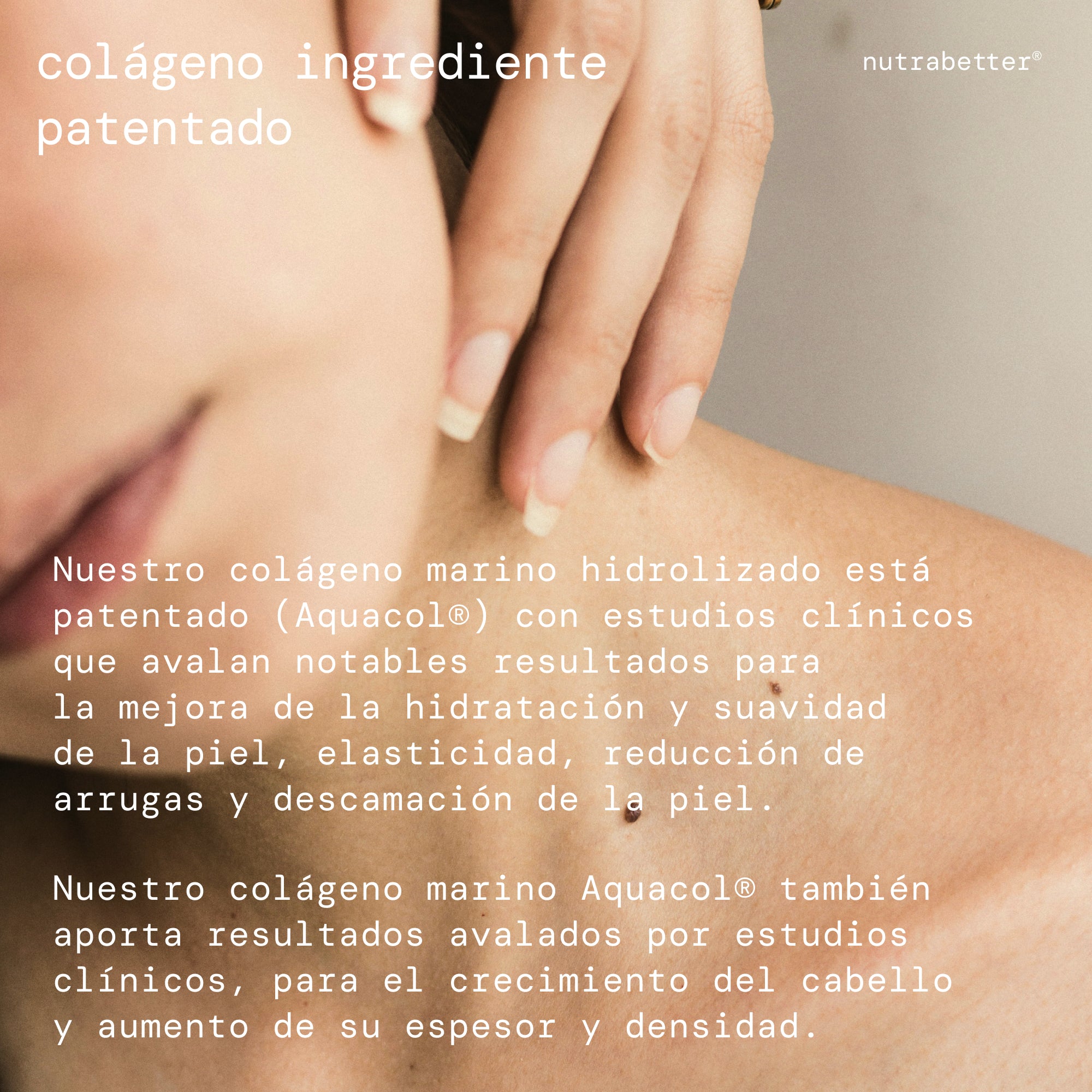 Nosso colágeno marinho hidrolisado é patenteado (Aquacol®) com estudos clínicos que sustentam resultados notáveis para melhorar a hidratação, maciez, elasticidade, redução de rugas e descamação da pele; bem como para o crescimento do cabelo e aumento de espessura e densidade.