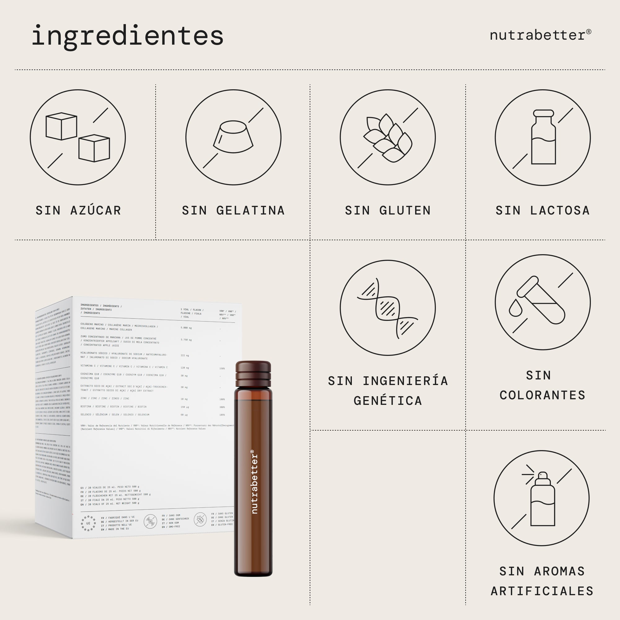 Água, Colágeno marinho hidrolisado (contém Peixe), Suco concentrado de maçã (Malus domestica Borkh), Emulsificante (Glicerol*), Regulador de acidez (Citrato de potássio), Acidulante (Ácido cítrico), Aroma de frutas vermelhas, Hialuronato de sódio, Vitamina C (L- ácido ascórbico), Coenzima Q10, Cor natural (Vermelho beterraba), Citrato de zinco, Extrato seco de açaí (Euterpe oleracea Mart.), Conservantes (Sorbato de potássio e benzoato de sódio), Vitamina B7 (D-biotina), Selenito de sódio.