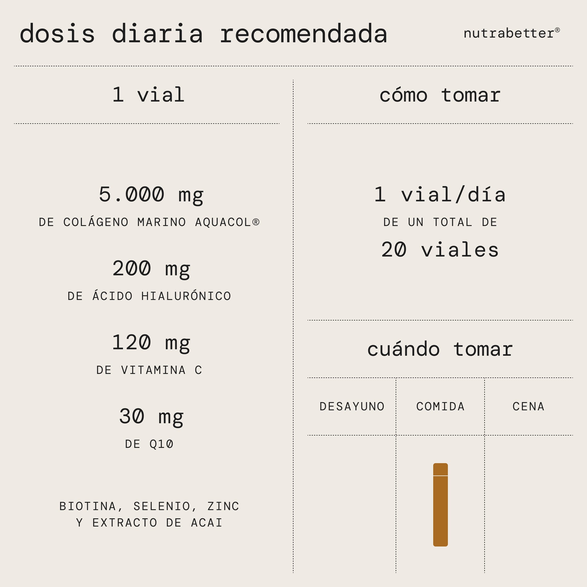 Cada dose diária (1 frasco) fornece 5.000 mg de colágeno marinho hidrolisado, o que equivale a 10 a 15 vezes mais colágeno que o formato de cápsula. Contém também 200 mg de ácido hialurônico, garantindo uma alta concentração de princípios ativos para resultados ótimos e visíveis.
