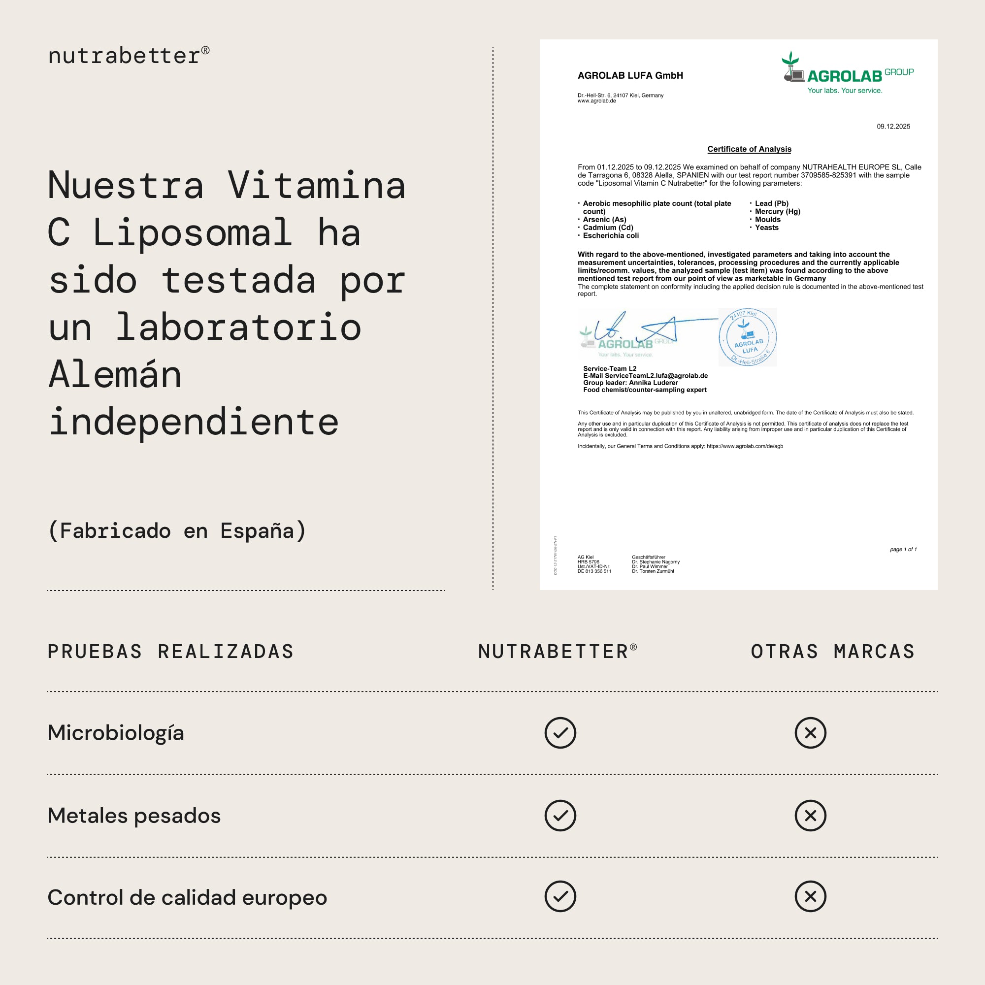 Nuestra vitamina C liposomal 1000mg está formulada con fosfolípidos de lecitina de girasol, lo que mejora significativamente su biodisponibilidad y permite una mejor absorción intestinal frente a la vitamina C tradicional.